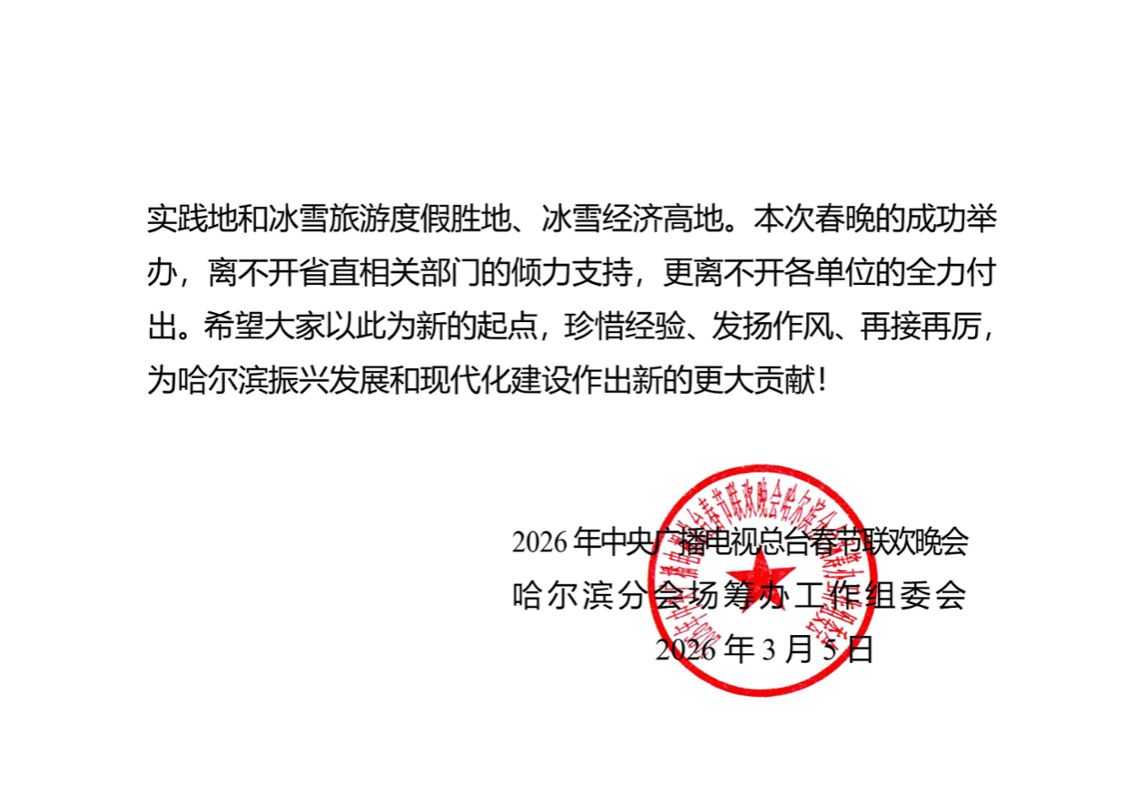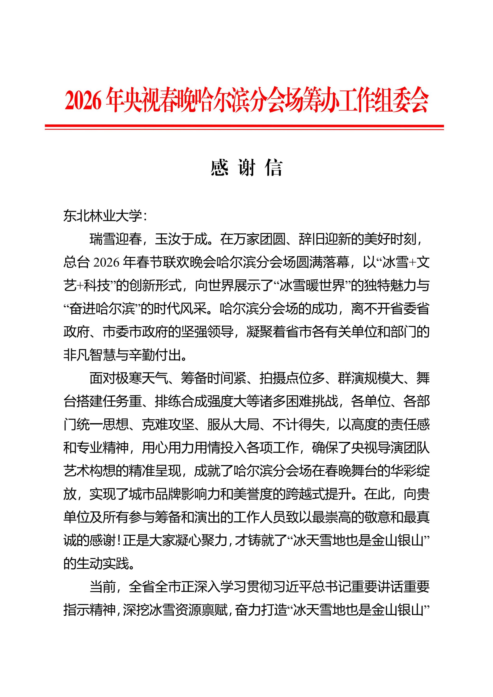 近日,我校收到2026年中央广播电视总台春节联欢晚会哈尔滨分会场筹办工作组委会发来的感谢信。信中对我校来华留学生积极配合春晚分会场节目拍摄工作及同学们参演过程中的优异表现予以肯定和赞扬。