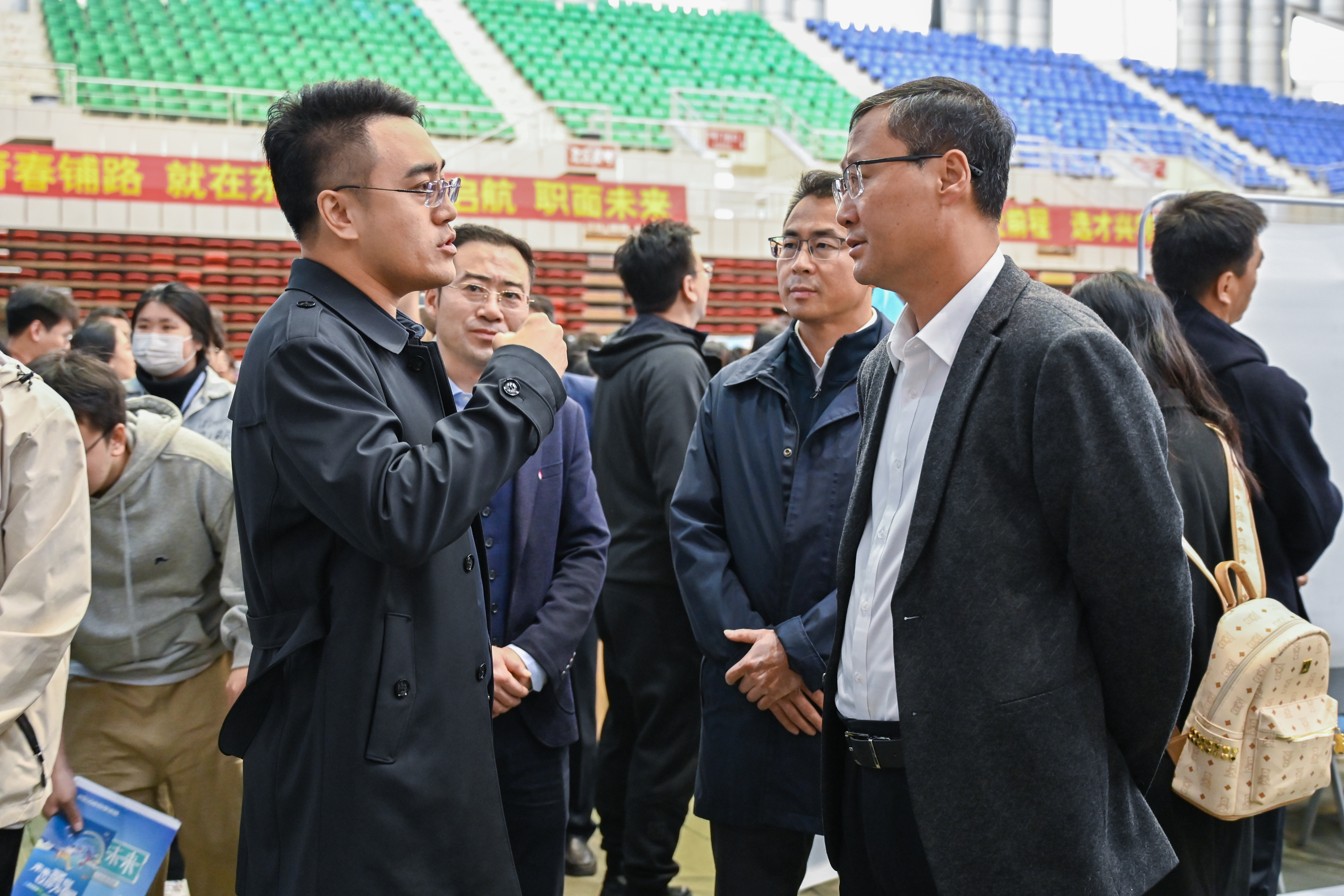 双选会期间,校长宋文龙,党委常委、副校长张春雷来到现场,与参展企事业单位代表、现场学生细致交流,充分了解新形势下用人单位的招聘需求、学生的求职情况以及供需双方对我校人才培养、学科建设、就业服务等方面的意见建议。