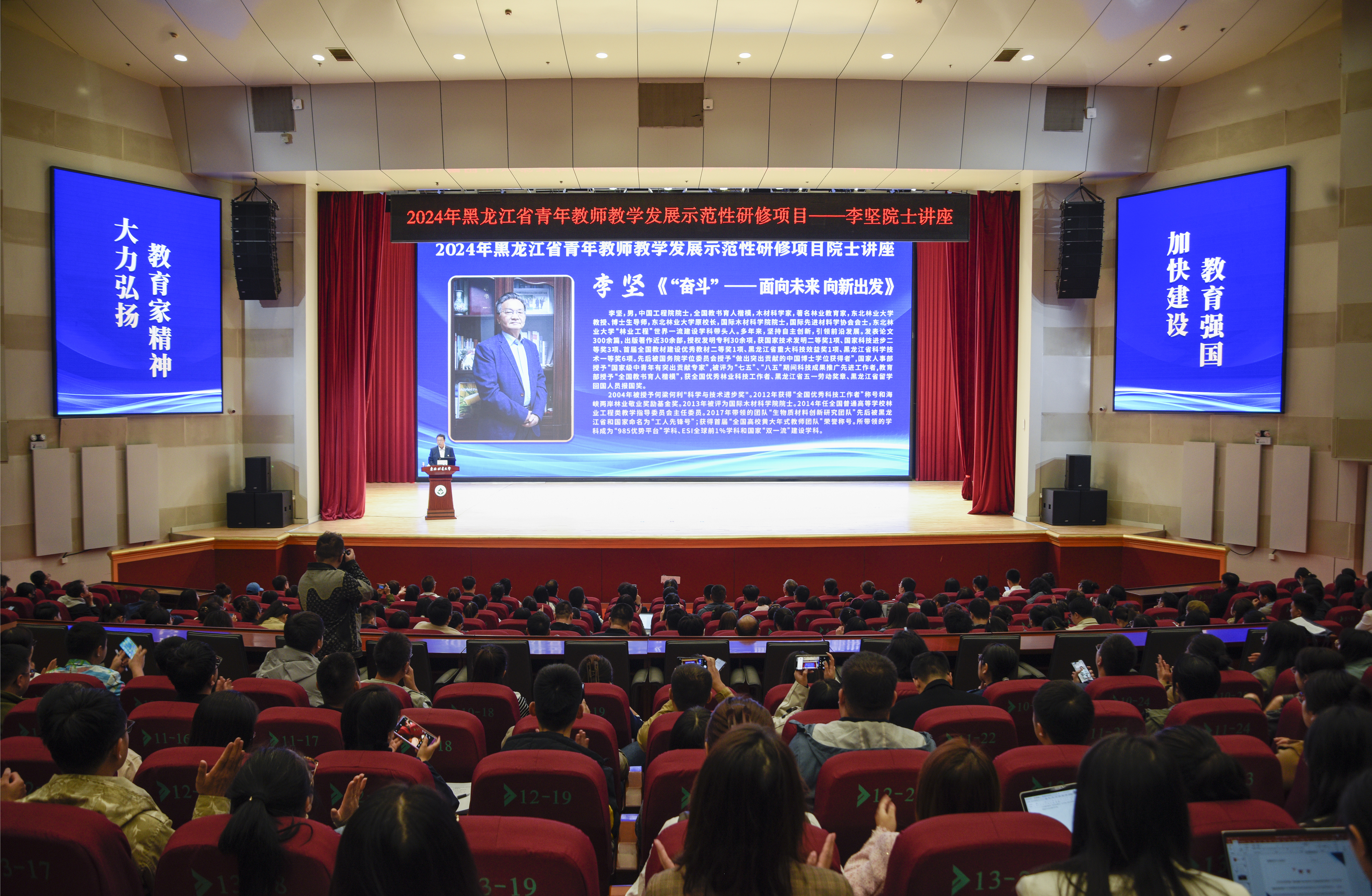 为大力弘扬教育家精神,加快建设教育强国,培养造就高素质教师队伍,9月26日上午,2024年度全国教书育人楷模、中国工程院院士、我校材料科学与工程学院教授李坚,在学校科学会堂为2024年黑龙江省青年教师教学发展示范性研修学员作专题讲座,传授为人、为师、治学的宝贵经验。学校党委常委、副校长李明泽主持讲座。