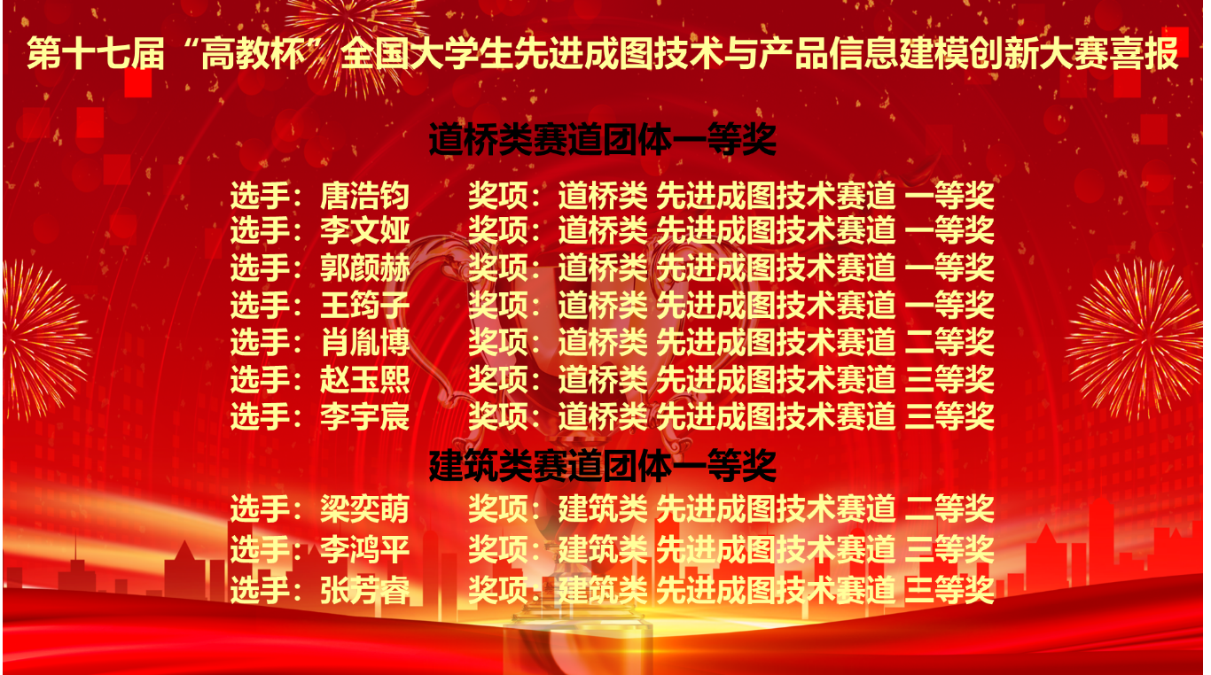 近日,第十七届“高教杯”全国大学生先进成图技术与产品信息建模创新大赛在贵州大学举行,我校土木与交通学院学子在道桥、建筑两个赛道获得一等奖4项、二等奖2项、三等奖4项,并在两个类别中都获得了团体一等奖,充分展示了东林学子的创新意识和协作精神。