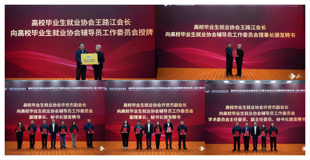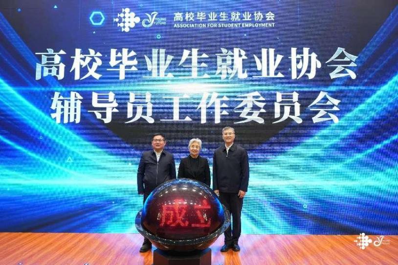王路江、张志坤、雒文虎在现场共同启动装置,标志着高校毕业生就业协会辅导员工作委员会正式成立。