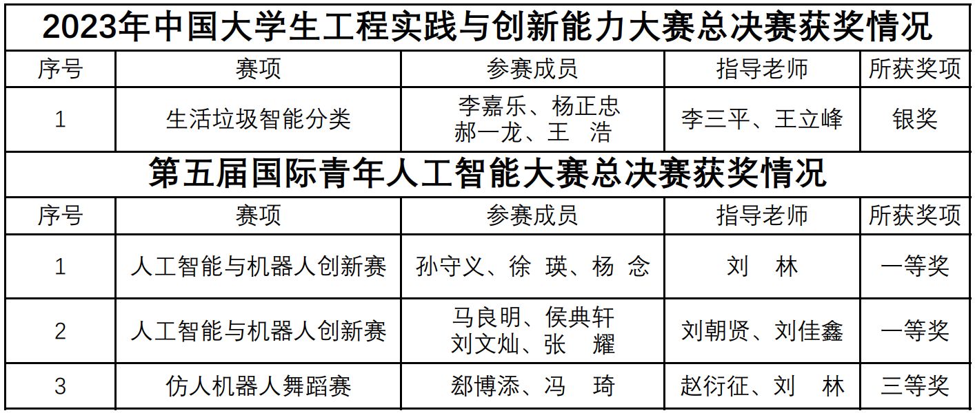 近日,2023年中国大学生工程实践与创新能力大赛总决赛、第五届国际青年人工智能大赛总决赛相继闭幕。我校学子荣获中国大学生工程实践与创新能力大赛银奖,在“智能+”赛道中首次入围全国总决赛。在国际青年人工智能大赛,我校学子首次参赛并斩获一等奖2项、三等奖1项。