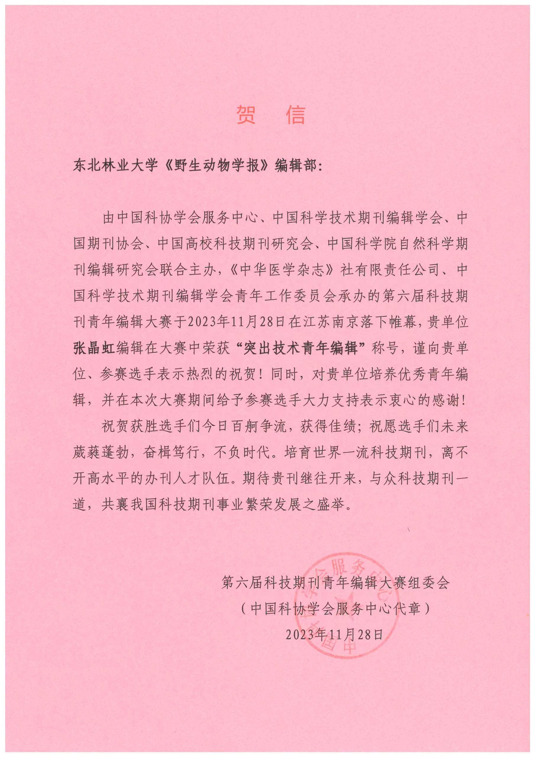 近日,第六届科技期刊青年编辑大赛决赛在江苏省南京市举办,我校《野生动物学报》编辑部张晶虹编辑荣获“突出技术青年编辑”称号,这是我校也是我省编辑首次进入决赛并获佳绩。