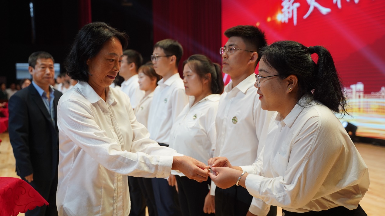 老教师为新入职教师佩戴入职徽章,寓意东林精神薪火相传。