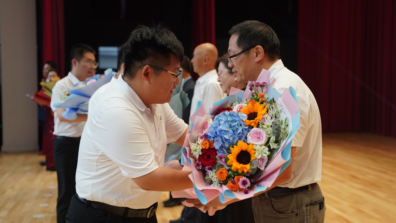 截至2023年7月,我校从教30年教师共33人。他们长期在教学一线默默耕耘,深受广大师生的敬重与爱戴。2023年,我校共有122名新入职教师,他们已经或即将步入教师队伍。活动现场,新入职教师为从教30年老教师代表送上鲜花。