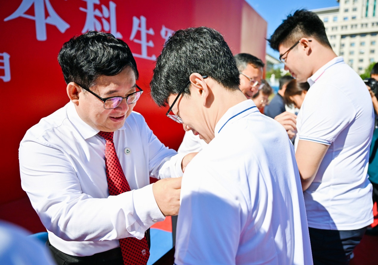 学校徽章是“东林精神”的凝聚,是“东林品格”的展现,是“东林人”身份的象征,也是东林人薪火相传的精神共鸣、赓续奋斗的精神标识,承载着东林人的荣耀和使命。在校歌声中,主席台就坐的各位领导为2023级新生代表佩戴学校徽章。