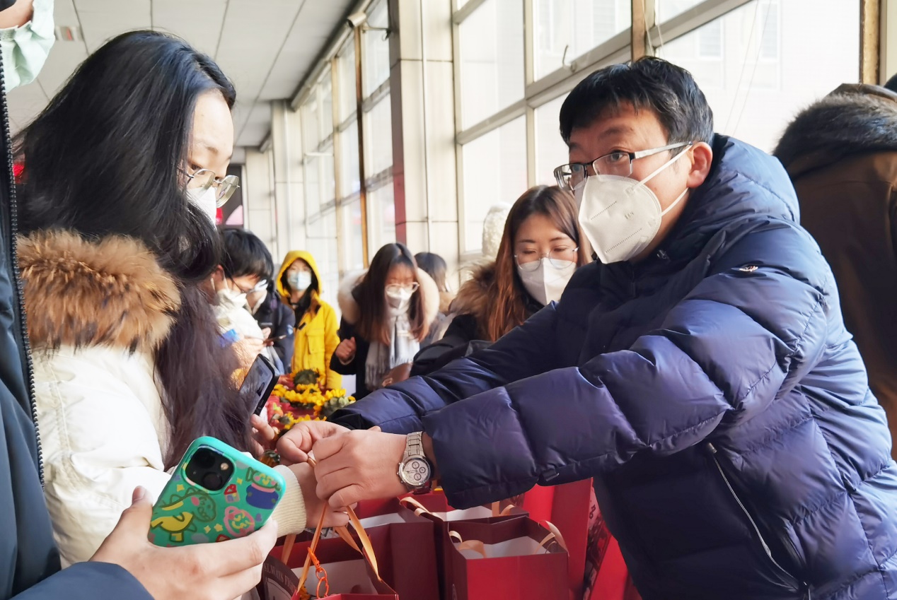 东林文创口罩、免洗手消、励志暖贴,好“柿”“花”生、考“柿”顺利的“柿柿”如意幸运挂件和零食,寓意着“研”途光明灿烂的向日葵、旗开得胜的“金榜题名”文具套装、乐事降临的乐事薯片……代表“‘大’有作为,‘袋’你上岸”的大号礼品袋完美收纳12件礼物,为“研”途中的学子们送去冬日的温暖。