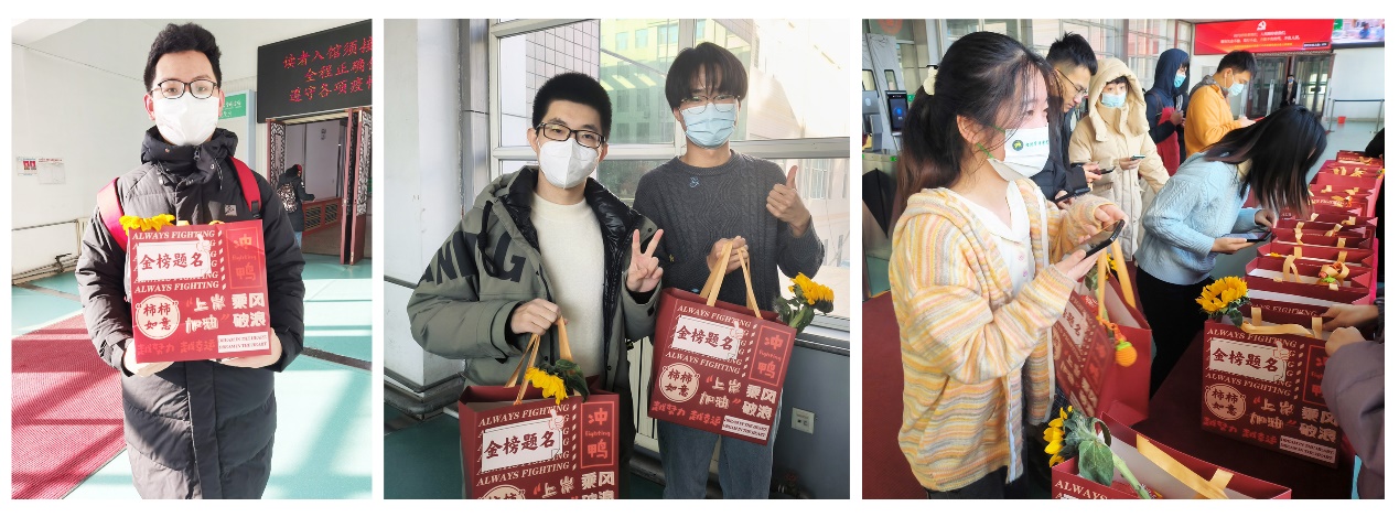 收到“考研加油包”的考研学子们纷纷在朋友圈晒图:“这个好事‘花’生又可爱又好吃”“‘柿柿’如意挂件正好可以用来当我的钥匙扣”“我们一定会像向日葵一样向阳生长,拥有光明的未来”……大家一致表示,学校的“考研加油包”就像是为他们打了一针强心剂,最后冲刺阶段一定会拼尽全力,学有所成。