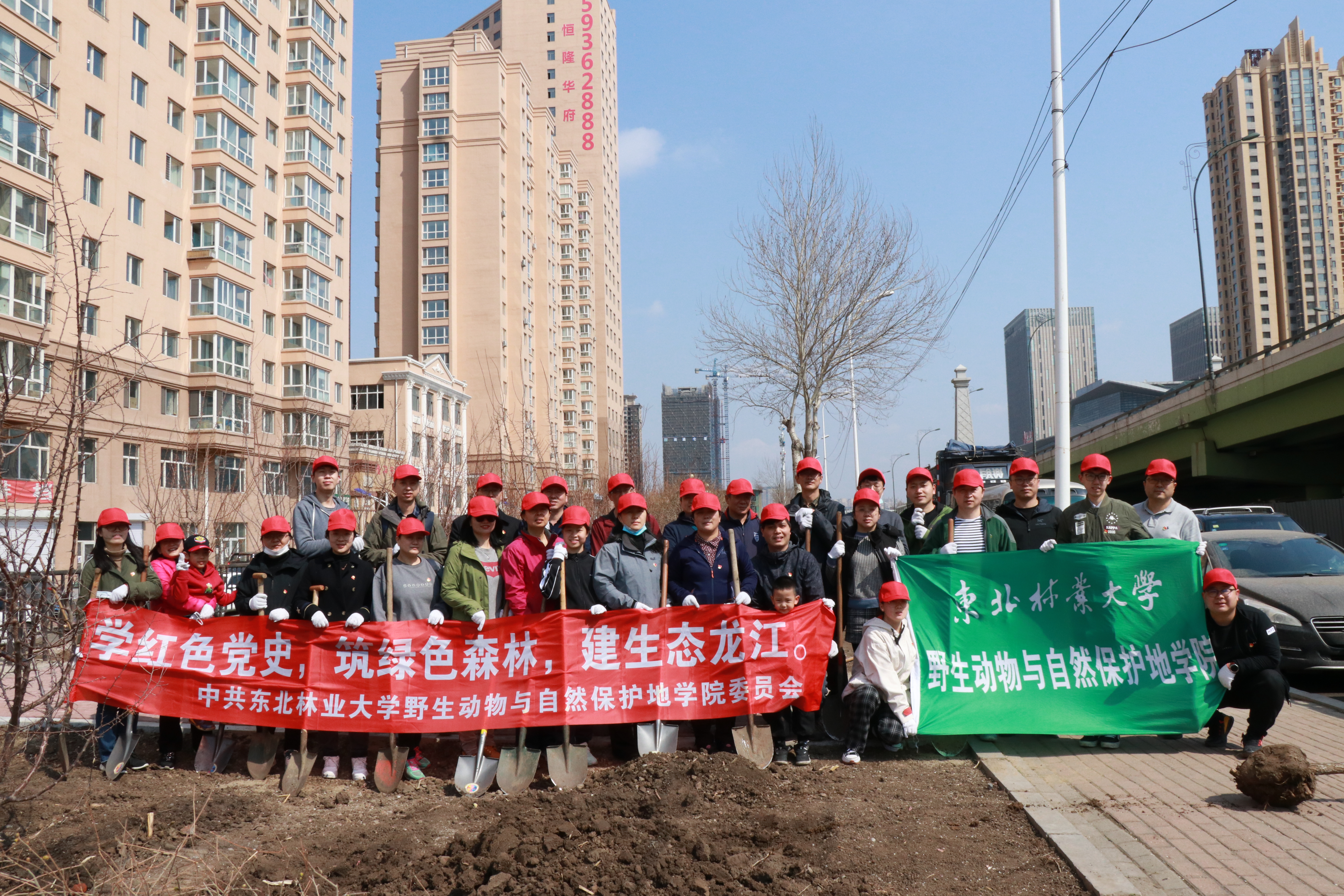 2021年4月,动保学院为香坊区恒隆华府小区义务植树50余株