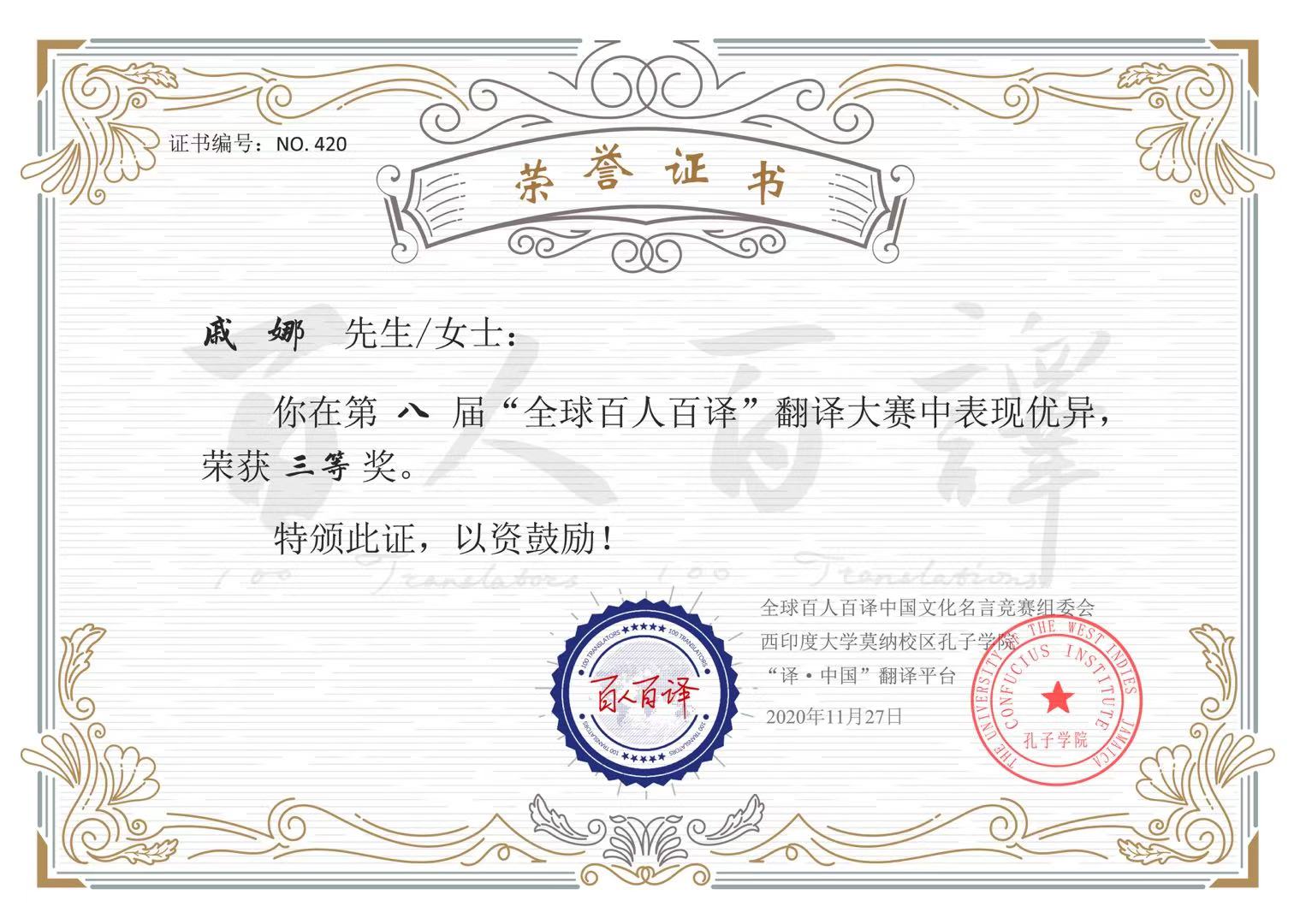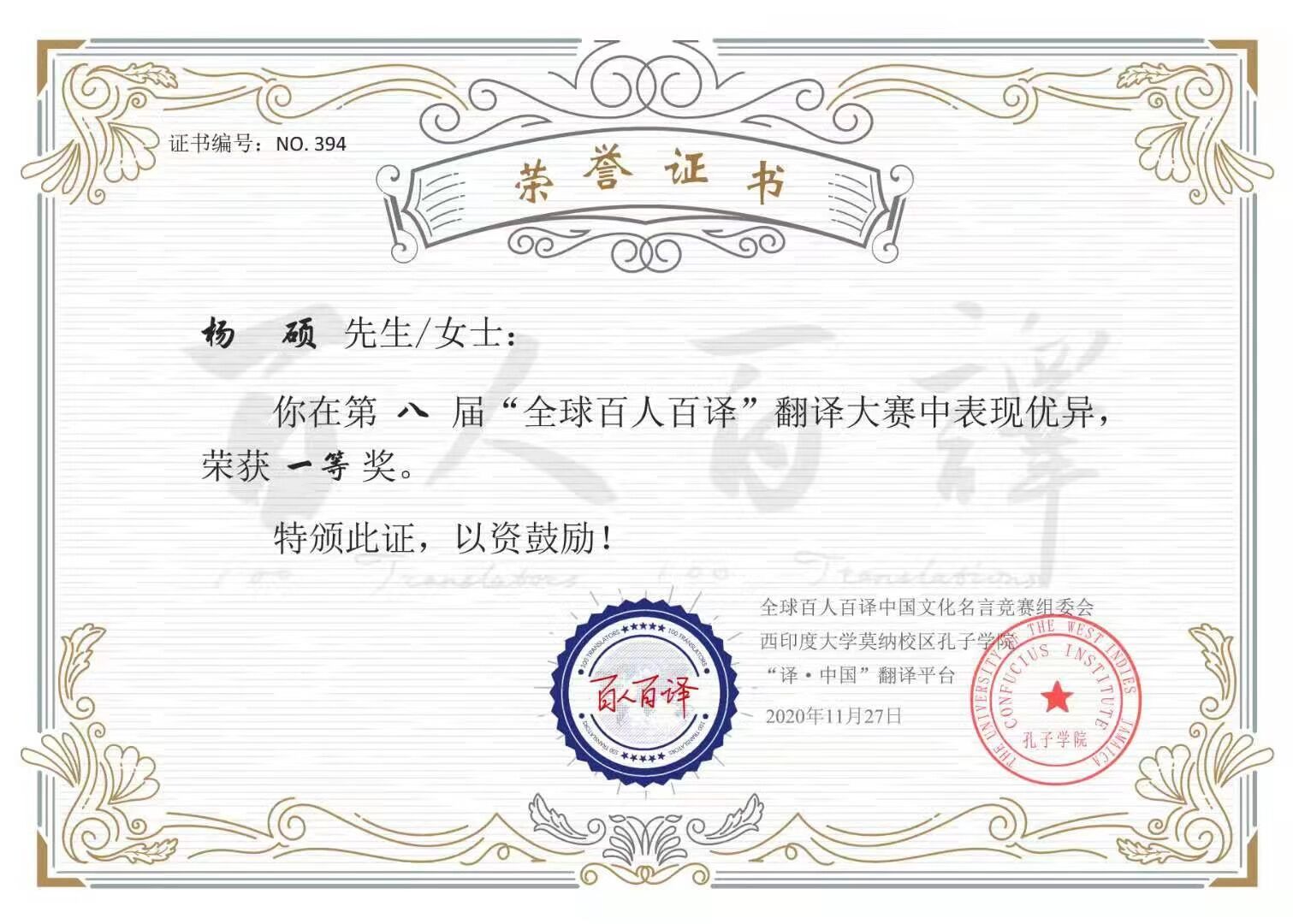 本次大赛由全球“百人百译”中国文化名言竞赛组委员会、西印度大学莫纳分校孔子学院共同举办。本次翻译比赛的评比标准是“信达雅+评者个人喜好”,根据6名英语为母语的外籍人士和4名中方评委的投票决定比赛名次。本次比赛为汉译英(笔译),分别按照Excellent, Very Good和Good三个档次投票,并按得票多少确定一、二、三等奖。由西印度大学莫纳分校孔子学校和“百人百译”中国文化名言竞赛委员会共同颁发证书。本次活动的参赛者来自全世界近百所知名高等院校,其中包括北京外国语大学、北理工珠海外国语学院、大连交通大学、北京交通大学、上海交通大学、Leeds University、UC Santa Barbara。最终比赛只评出8个一等奖,我校杨硕位列其中。