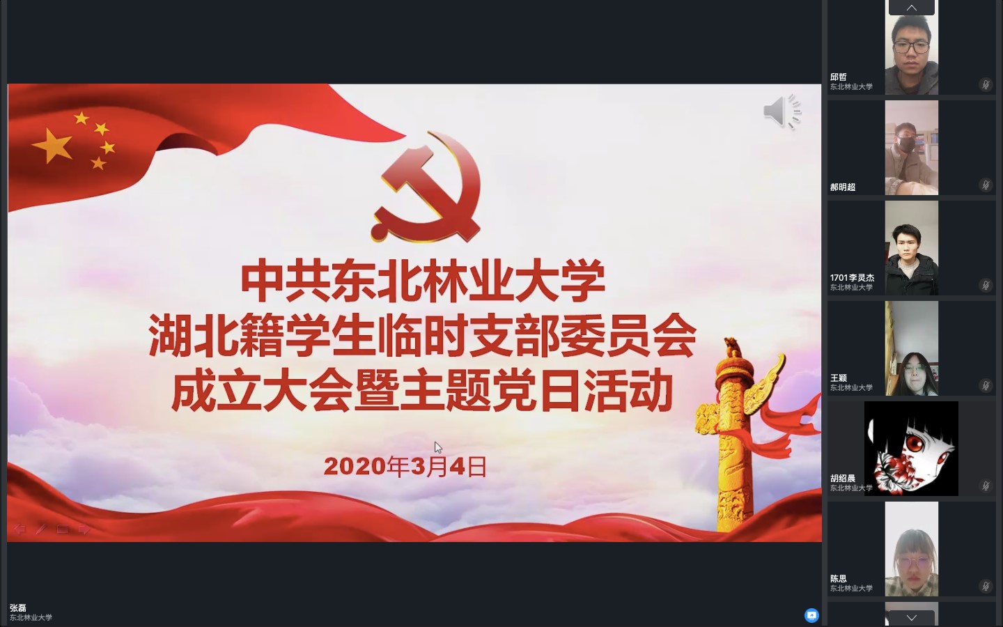为贯彻落实党中央关于统筹推进新冠肺炎疫情防控的工作部署,落实《中共东北林业大学委员会关于充分发挥各级党组织战斗堡垒作用和党员先锋模范作用、打赢疫情防控阻击战的通知》的文件精神,积极做好湖北籍学生党员在疫情防控期间的思想政治工作和湖北籍学生防疫期间的各项帮扶工作,学校决定成立湖北籍学生临时党支部。 3月4日下午2时,成立大会通过钉钉视频会议召开,学校党委常委、副校长雒文虎,学校党委常委、党委统战部部长、机关党委书记高玉娟,党委学工部部长、学生处处长、武装部部长王春海出席了成立大会,临时党支部的全体党员参加了大会。此次成立的湖北籍学生党员临时党支部共有党员44人,由11个学院的37位同学和7位政工干部老师组成,其中包括本科生22名,研究生15名。在疫情结束、同学们返校之前,临时党支部将通过开展支部组织生活、支部主题党日活动等形式激励引导支部成员在疫情防控斗争中不忘初心、牢记使命,凝心聚力、共克时艰。