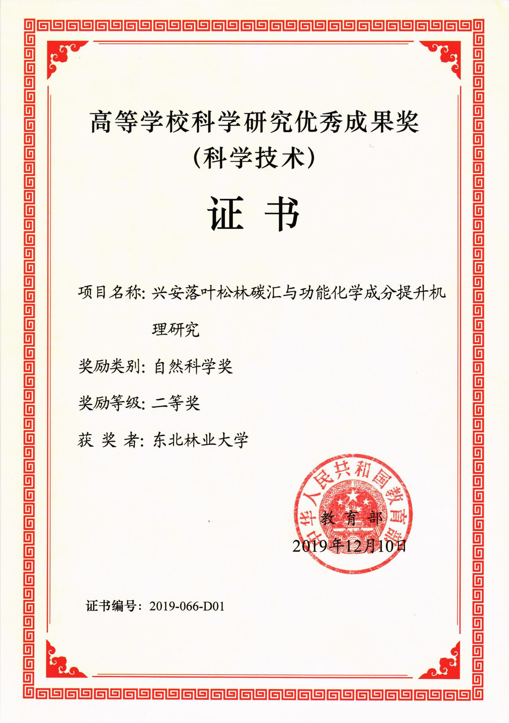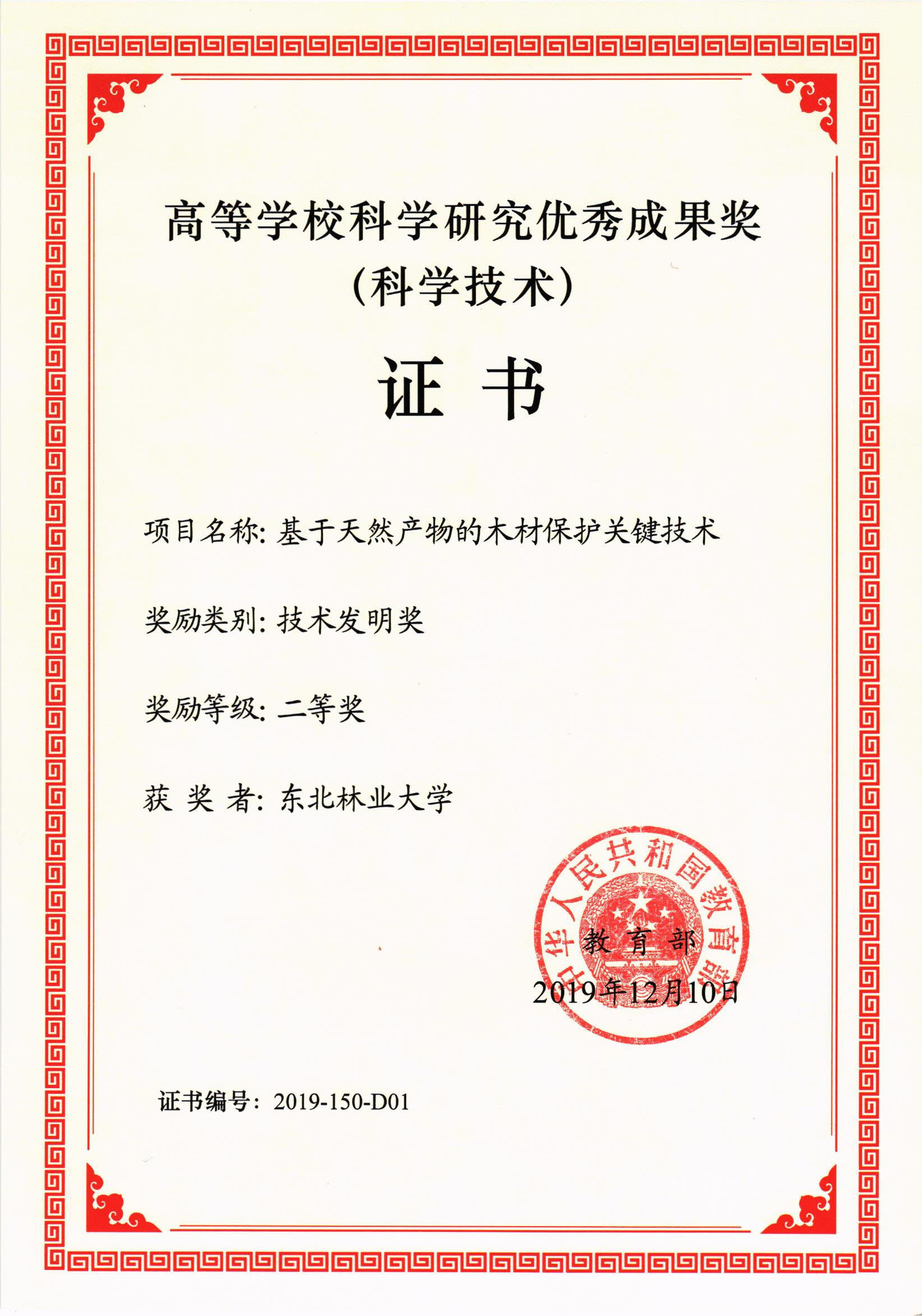 化资学院王文杰教授主持完成的“兴安落叶松林碳汇与功能化学成分提升机理研究”获自然科学二等奖;材料科学与工程学院李淑君教授主持完成的“基于天然产物的木材保护关键技术”获技术发明二等奖。获奖数量上,以第一完成单位统计数据排名在哈高校中与哈尔滨工业大学持平,在全国林业高校中位列第二。