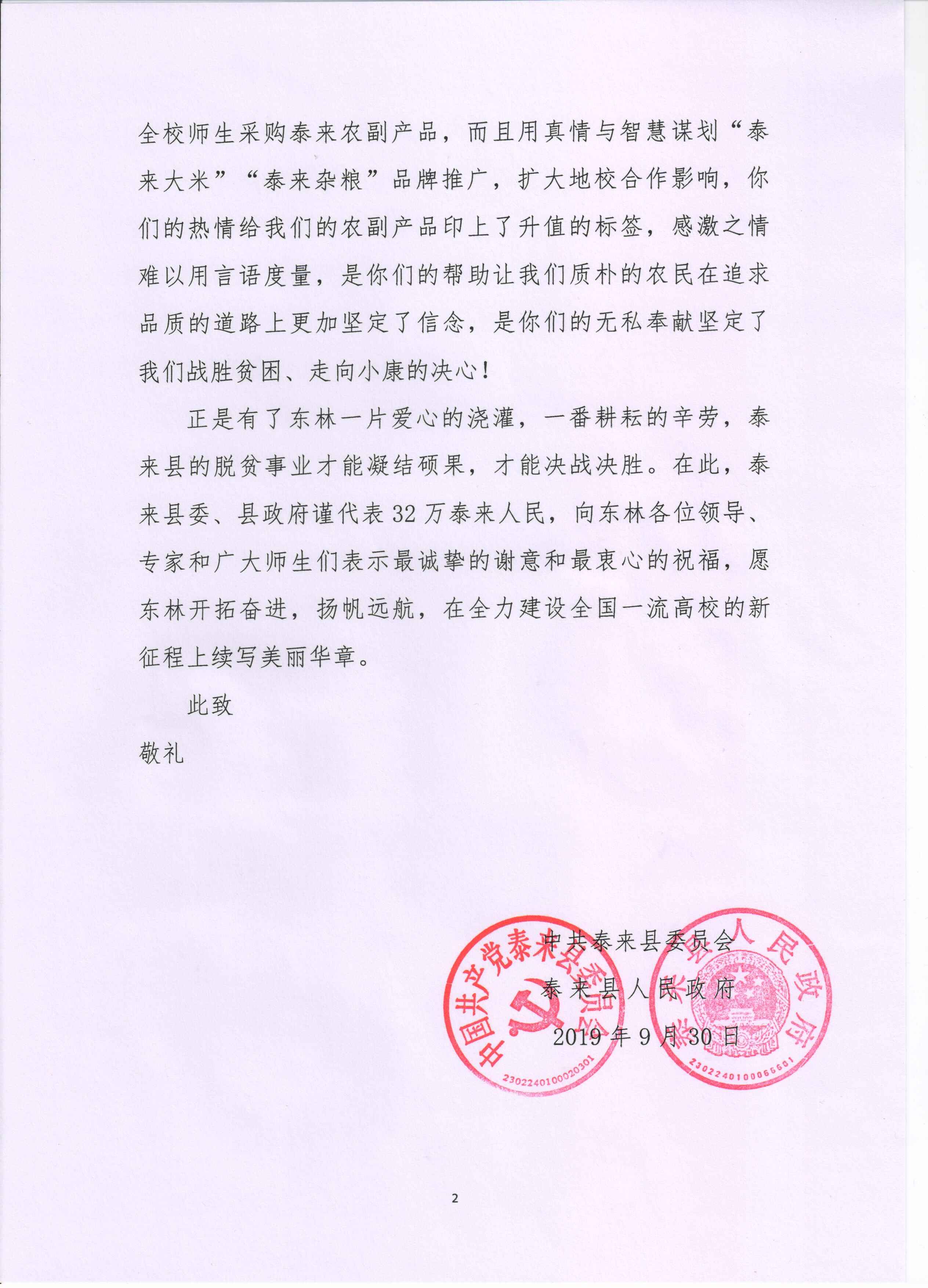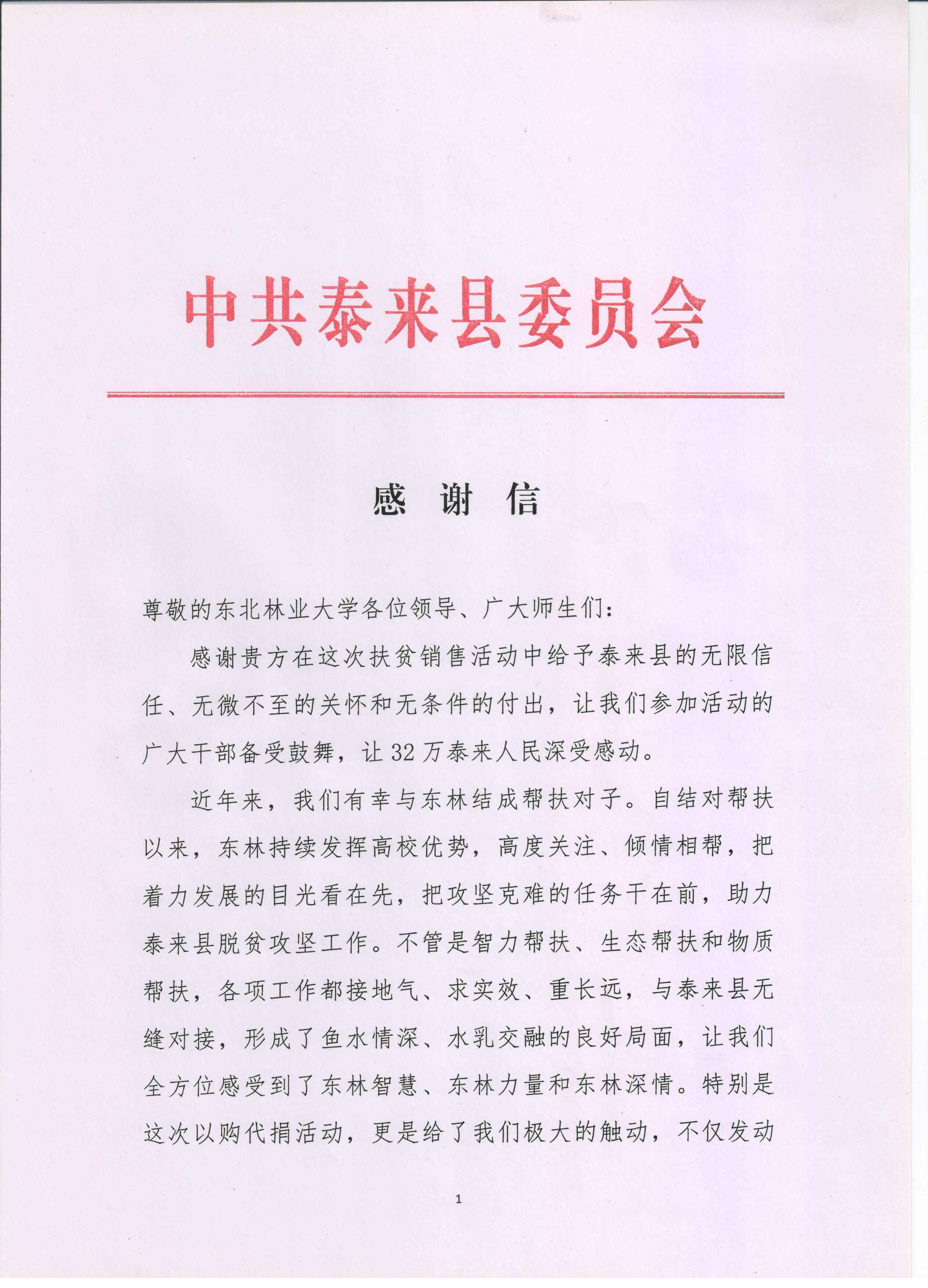 近日,泰来县委县政府向我校发出感谢信。代表全县32万人民,感谢学校在定点扶贫过程中“持续发挥高校优势、高度关注、倾情相帮”“各项工作接地气、求实效、重长远”。特别是在“泰来扶贫产品展销会”上,全校教职员工倾情付出,为泰来县战胜贫困、走向小康注入强大动力。