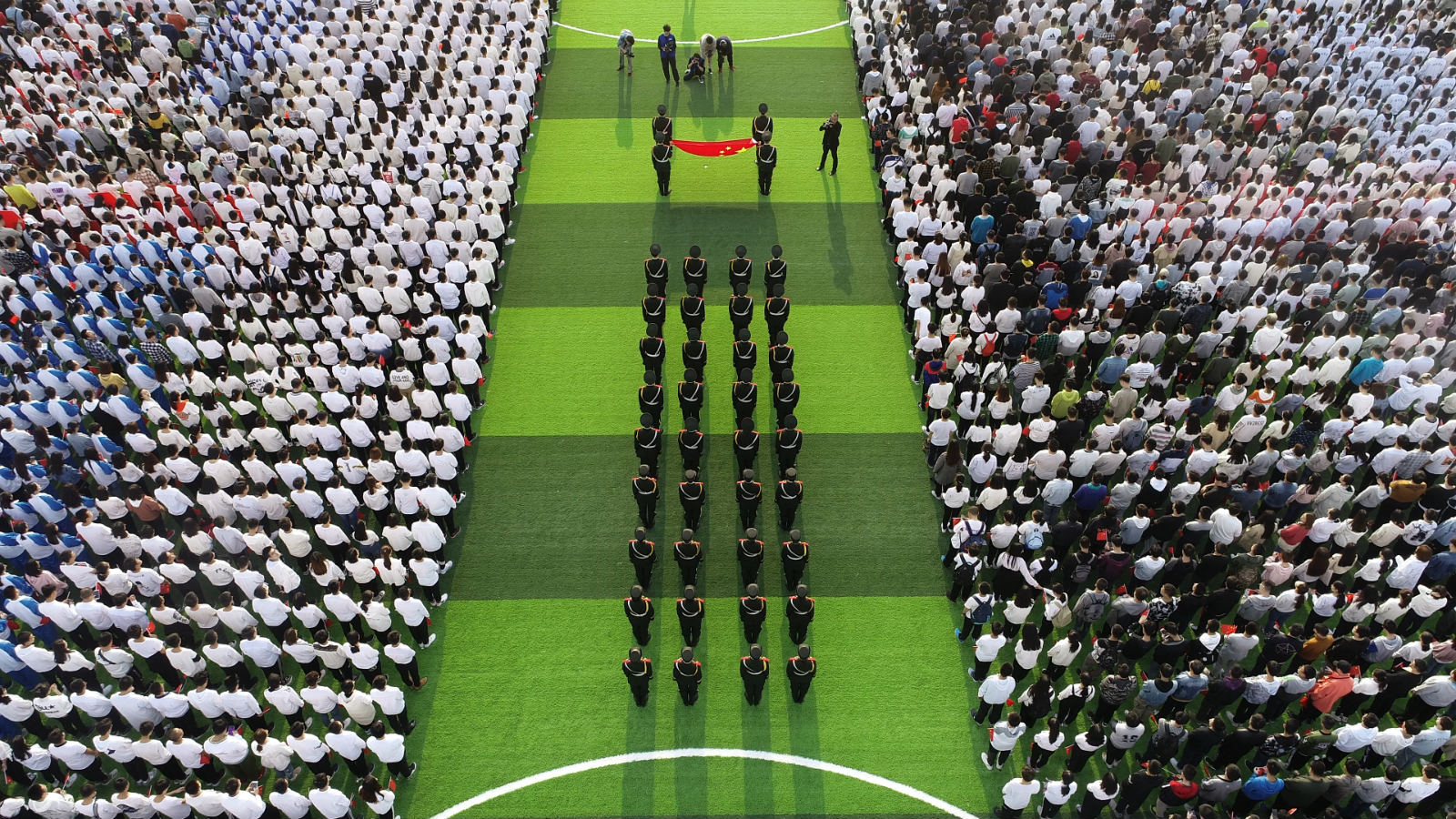 活动的最后,师生共同进行了青春告白祖国快闪环节。全场师生高声喊出:五星红旗我为你自豪!伟大祖国我为你骄傲!我爱你中国!紧接着《歌唱祖国》的旋律响起,全场师生高声合唱,挥舞的红旗汇成了红色的海洋。同学们组成的“十一”字块浮现在整齐的方阵之中。巨幅国旗在歌声中徐徐展开,漫卷的五星红旗在阳光下熠熠生辉,嘹亮的歌声响彻全场。每一个人都被庄严的仪式和身逢伟大时代的自豪所感染,整场的氛围在这一刻达到了高潮。