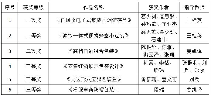 本次大赛历时半年,共收到来自全国70多所高等院校的有效参赛作品886件。通过网络初审,现场专家预审、复审、终审,评选出一等奖13项,二等奖34项,三等奖69项。我校工程技术学院包装工程系共提交作品27项,获奖情况如下: