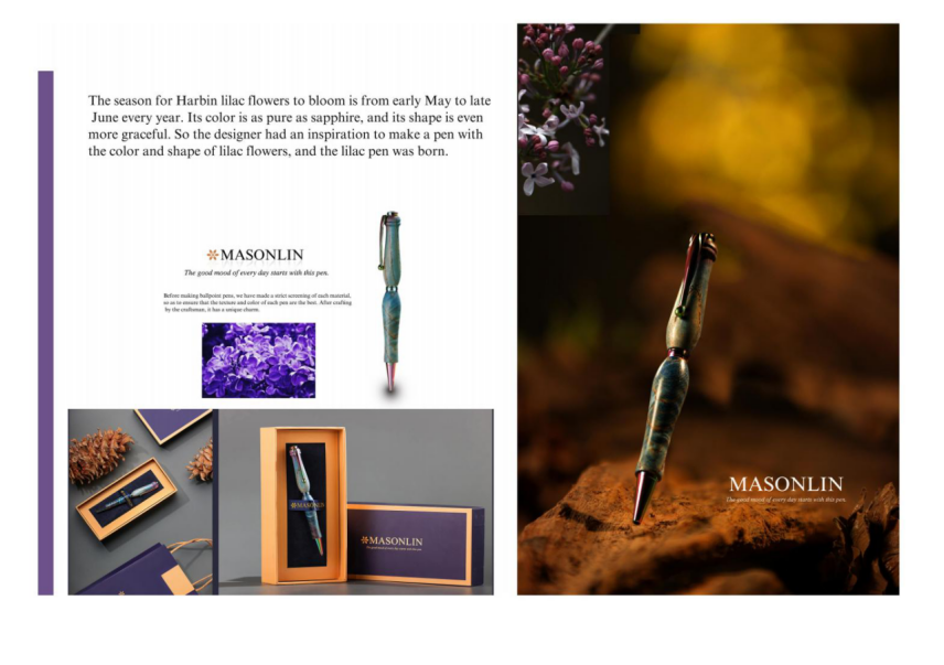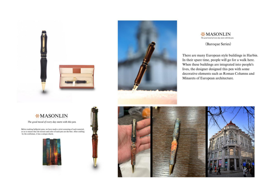 我校教师的手工笔作品《MASONLIN》是一系列纯手工打造的木制笔,由设计者手工制作而成,以哈尔滨独特的地域文化为载体展开的创意构想,通过对笔的造型与材料的设计,表达这座城市中不同的设计主题,来展现哈尔滨的冰雪文化、欧式建筑特征、丁香花之美以及哈尔滨的四季变化。意在以笔为载体,蕴城市之特色,展尔滨之风采。
