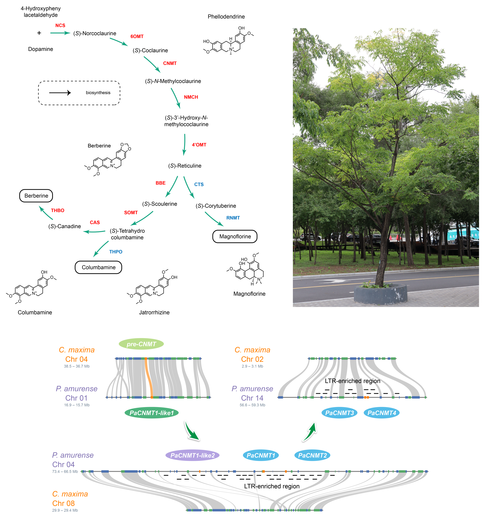 比较基因组分析表明,黄檗为古八倍体物种,其形成源于约2150万至2731万年前的多次杂交事件,并最终融合了四个祖先谱系的遗传物质。研究还首次在木本植物中证实了LTR反转录转座子可推动次生代谢途径进化,通过解析CNMT基因家族扩张,为理解黄连素、黄檗碱这类特殊代谢产物的起源提供了新视角。