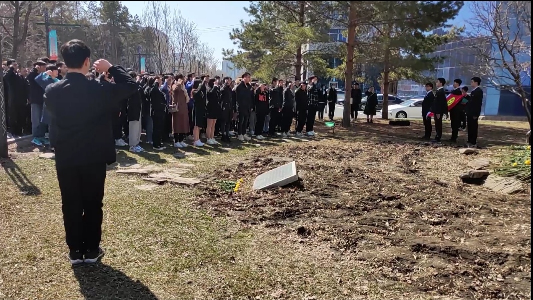 徐秀娟烈士雕像前,全体团员青年肃立瞻仰雕像,志愿者代表认真祭扫,给雕像拭去尘土。同学们共同追忆徐秀娟烈士生平,在歌曲《一个真实的故事》的旋律中依次向烈士雕像敬献花束,用鲜花寄托哀思,并集体默哀。团员代表于航同学在发言中表示,要以徐秀娟烈士为榜样,把鹤魂精神发扬光大,要认真学习党史,坚定听党话、跟党走,以优异成绩向这个伟大的时代致敬。活动最后,在场的团员青年在团员代表荆一博同学的带领下,重温入团誓词。