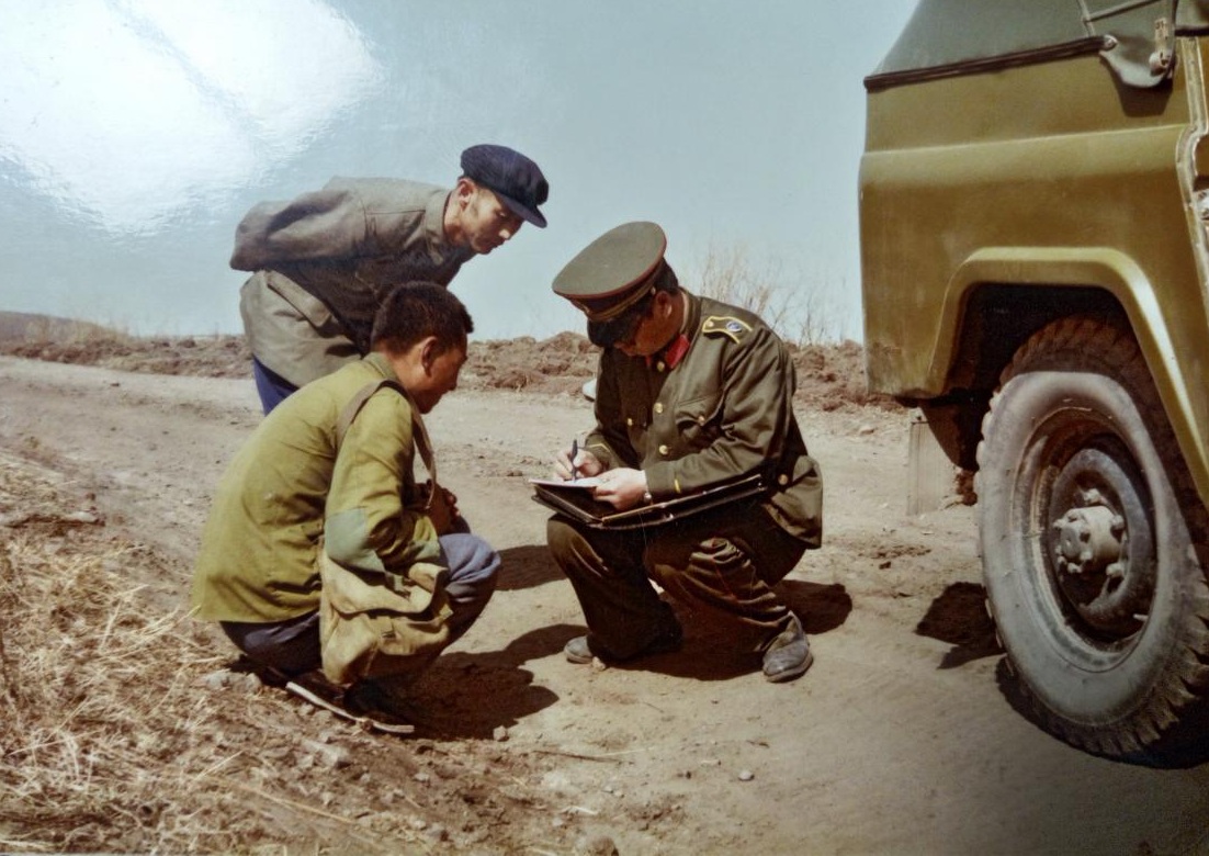 (上世纪八十年代,吕秉臣调任总厂副厂长,主管森林防火。图为因附近发现火点,随即对行人进行盘查。弓腰站立者为吕秉臣)