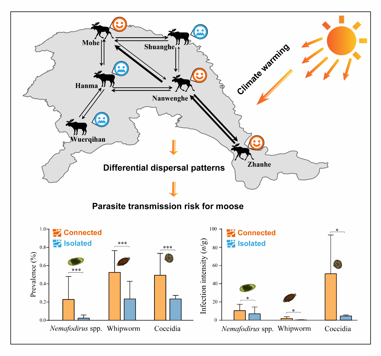 近日,学校姜广顺教授团队在前期揭示气候变暖驱动驼鹿(Alces alces)种群向西北退缩、并改变其肠道微生物群落结构与功能的基础上(Chen et al., 2022,Science of the Total Environment; Chen et al., 2022,Journal of Zoology),进一步整合基因流分析、寄生虫形态学鉴定、粪便皮质醇测定及环境-营养-微生物互作等多维度数据,首次系统发布了我国东北地区不同扩散模式驼鹿种群的肠道寄生虫感染与生理应激响应特征。研究揭示了气候变暖驱动下,宿主扩散行为如何介导肠道寄生虫感染风险及生理应激反应,阐明了不同基因流模式在塑造驼鹿-寄生虫共存关系中的关键作用,为理解热敏感野生动物对气候变化的生态适应机制提供了全新视角。相关研究成果以“Climate-driven Moose dispersal mediates intestinal parasite infection risk and physiological stress responses”为题,发表于国际动物学经典期刊Journal of Mammalogy。