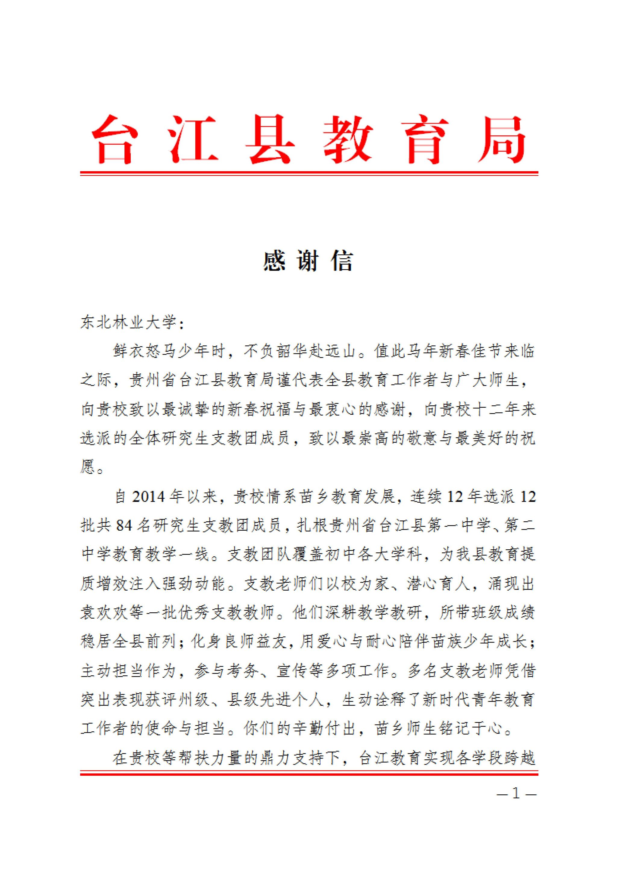 日前,学校收到来自台江县教育局的感谢信。信中,台江县教育局对学校12年来选派的全体研究生支教团成员,致以最崇高的敬意与最美好的祝愿。