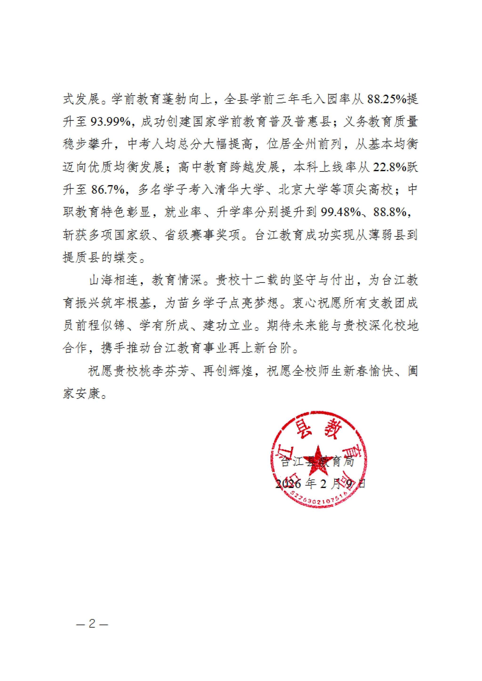 信中写道,贵校情系苗乡教育发展,扎根贵州省台江县第一中学、第二中学教育教学一线,支教团队覆盖初中各大学科,为我县教育提质增效注入强劲动能,多名支教老师凭借突出表现获评州级、县级先进个人,生动诠释了新时代青年教育工作者的使命与担当。你们的辛勤付出,苗乡师生铭记于心。