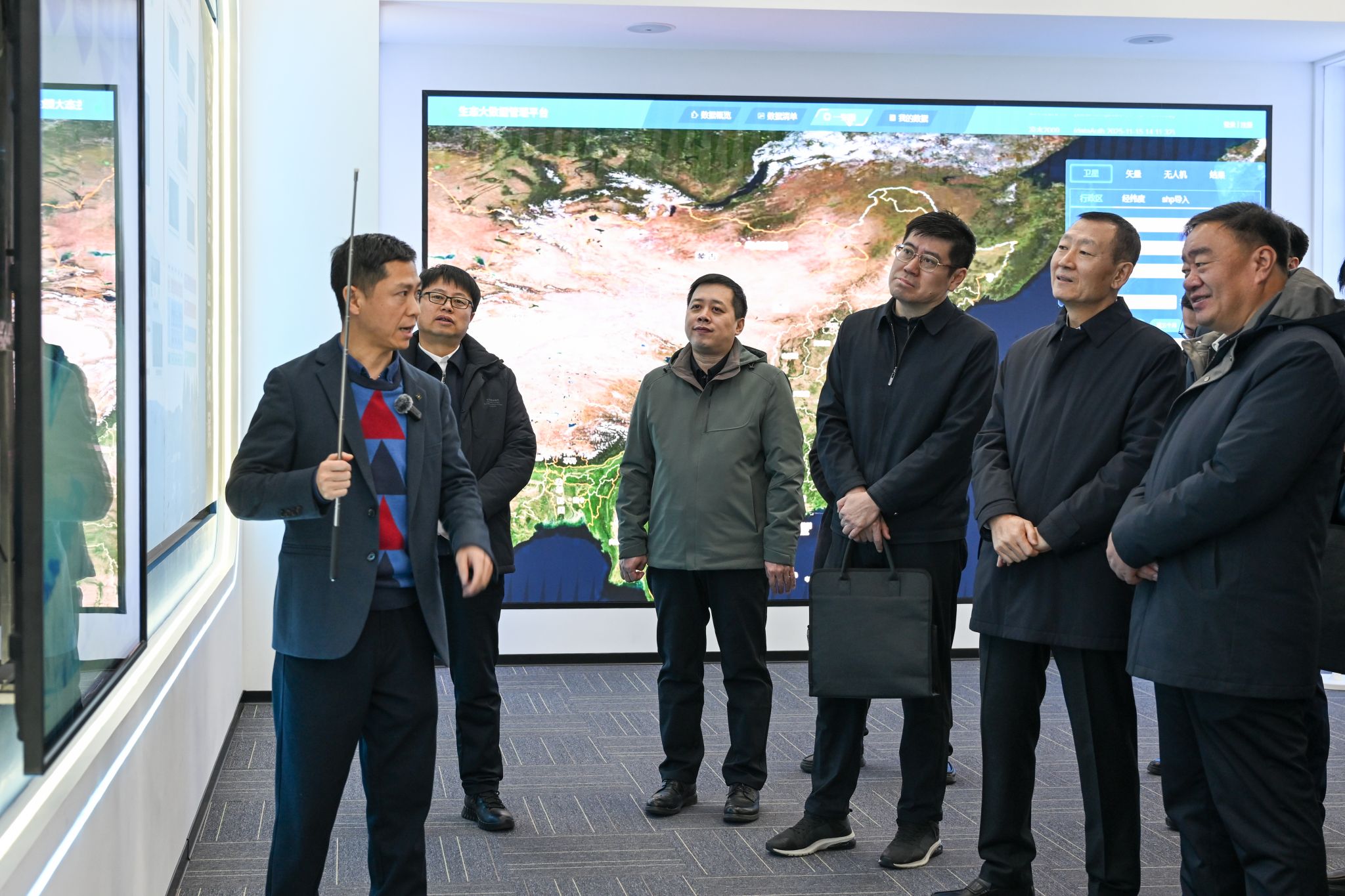 调研期间,张常荣一行实地走访了我校生态系统大数据研发中心。作为学校服务国家生态战略、助力“双一流”建设的重要科研平台,该中心深耕智慧林业建设,构建天空地一体化监测体系,研发系列数据产品,相关技术与服务已覆盖全省多个林业局、林草部门,为龙江林业生态保护与科学管理提供了坚实的技术支撑。调研组对中心的实践成果给予高度肯定,认为学校的科研方向与龙江生态建设需求高度契合,科研成果具备极强的实践应用价值。