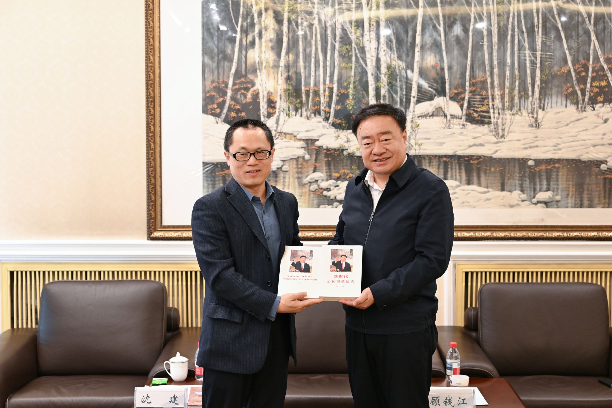 新华出版社副总裁、党委委员、董事沈建向孙猛赠送了新华通讯社编撰的《新时代治国理政纪实》等书籍。