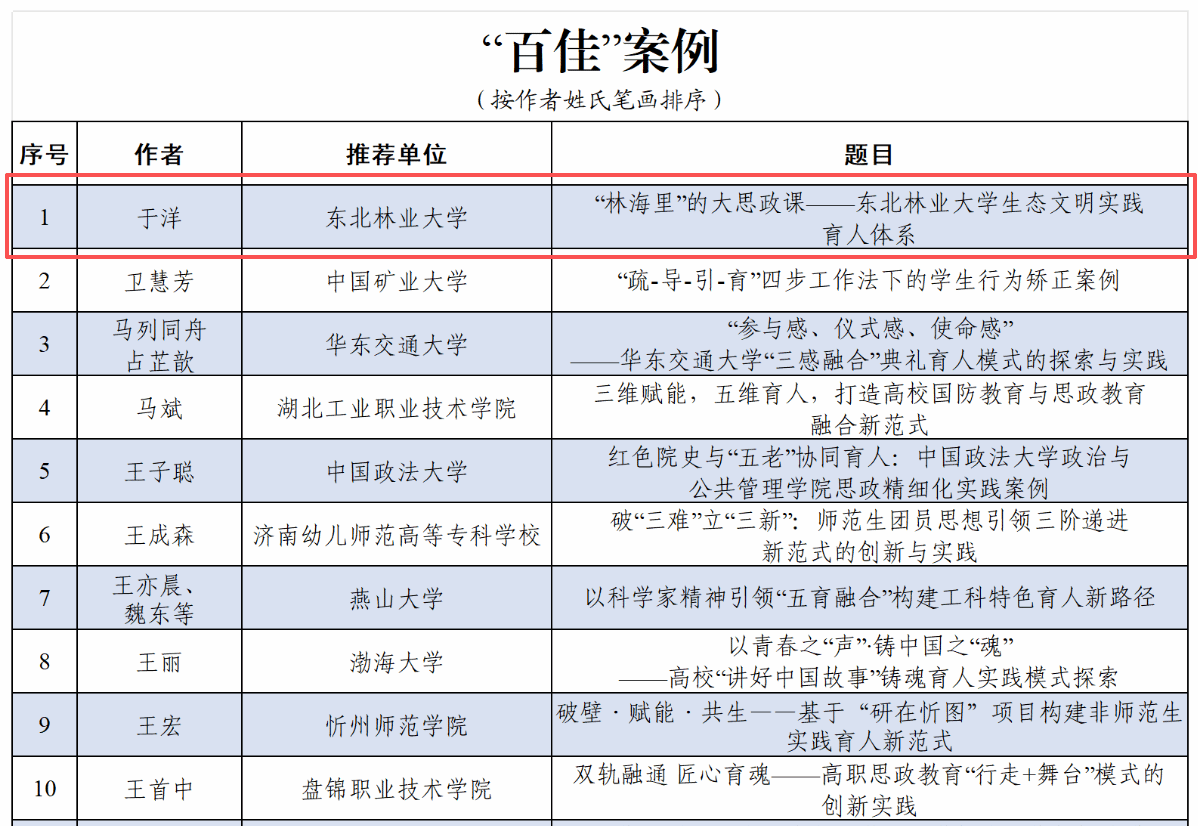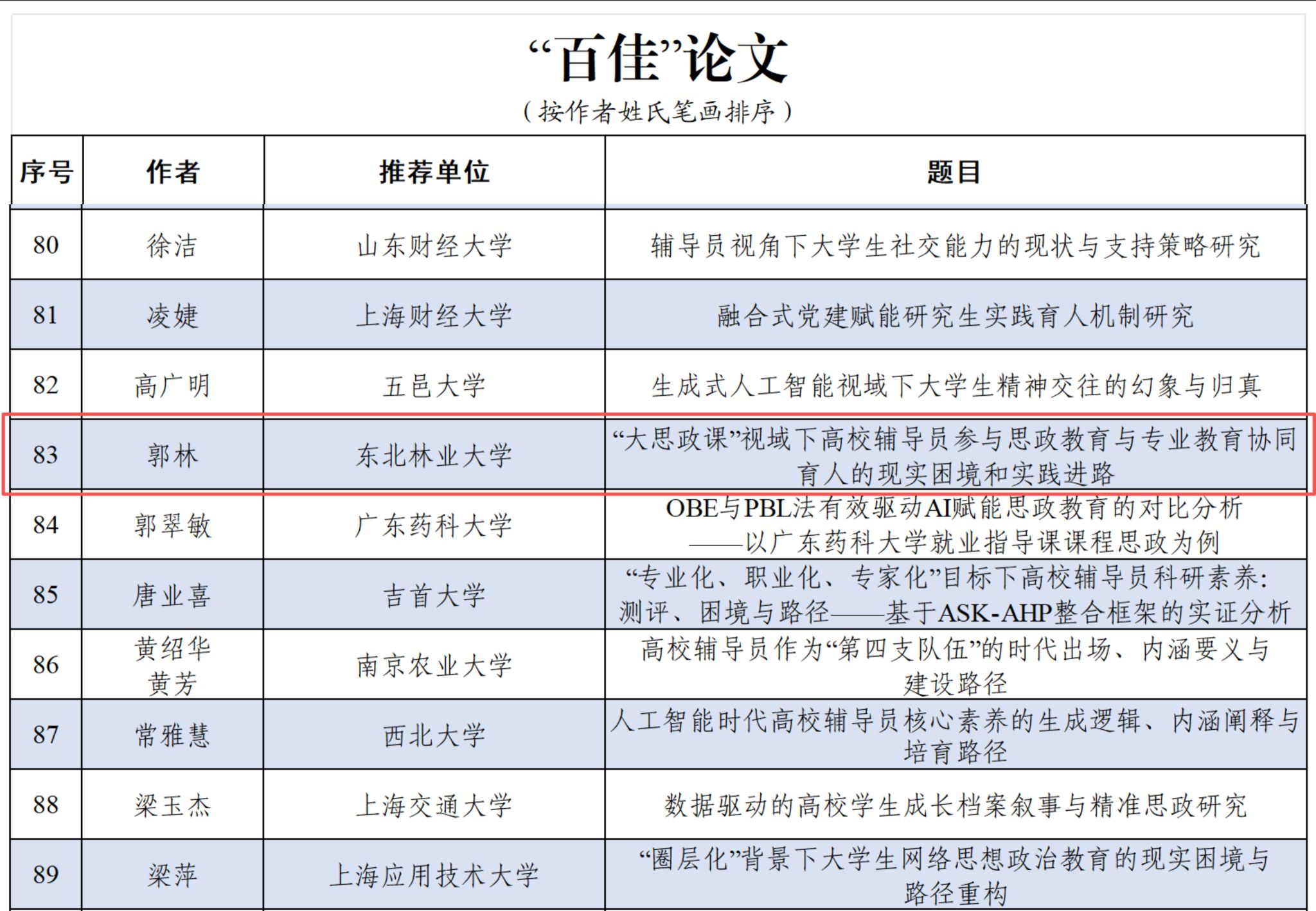 入选名单中,外国语学院郭林撰写的论文《“大思政课”视域下高校辅导员参与思政教育与专业教育协同育人的现实困境和实践进路》入选“百佳”论文;党委学生工作部于洋撰写的工作案例《“林海里”的大思政课——东北林业大学生态文明实践育人体系》入选“百佳”案例。