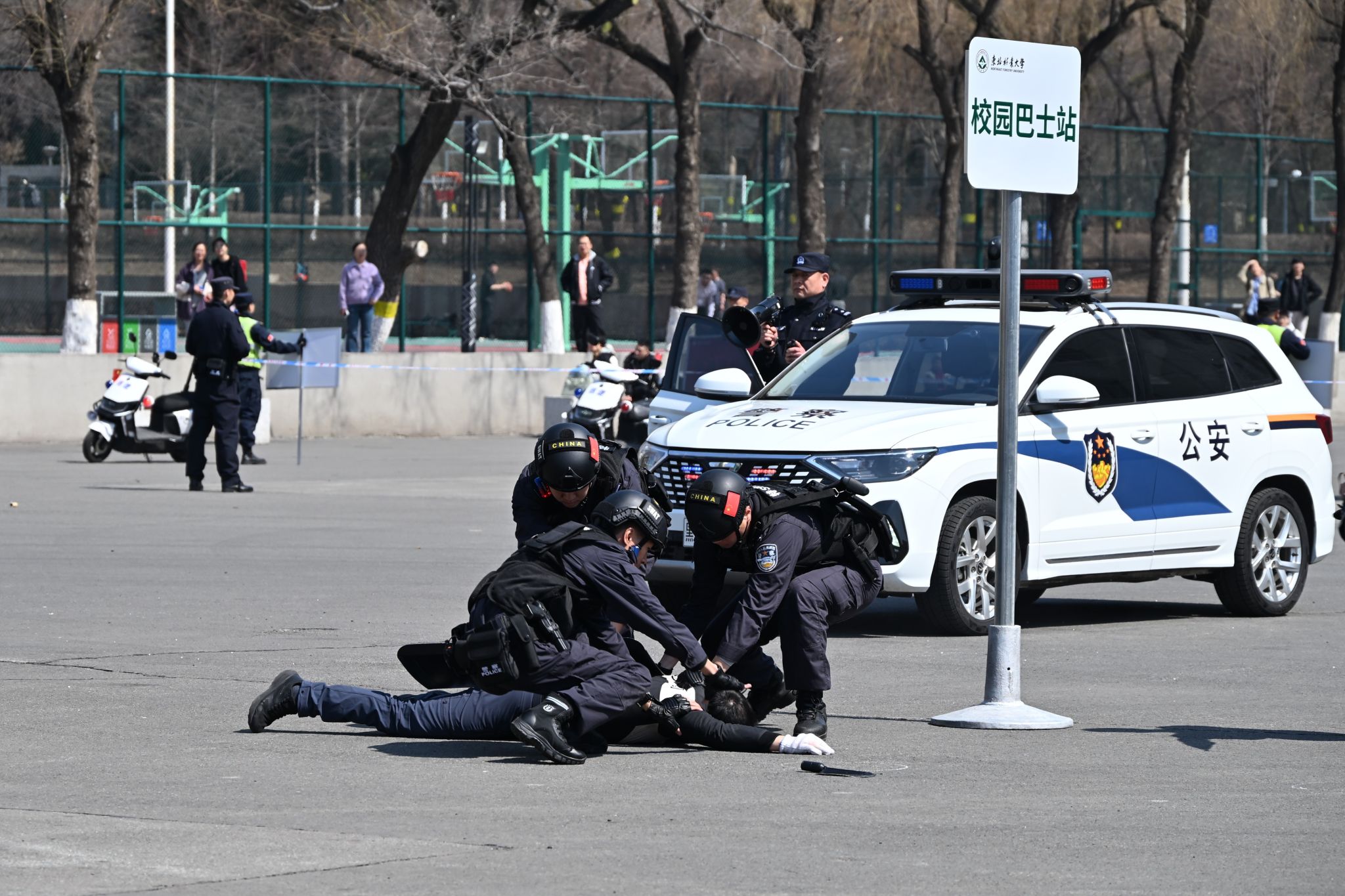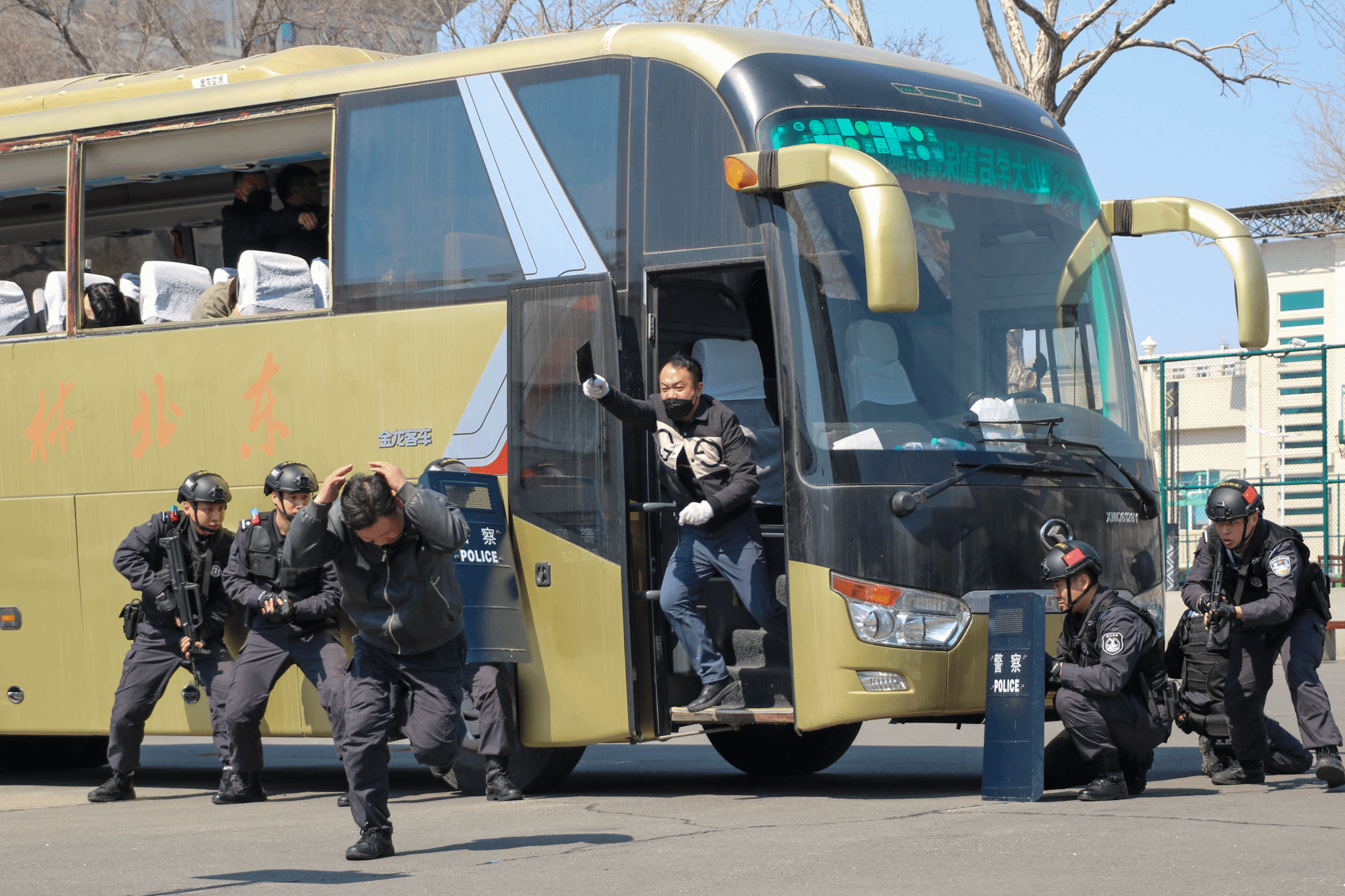 “不许动!再靠近我就对人质不利!”4 月 15 日,学校太极广场气氛紧张,一名 “歹徒” 在校园巴士内挟持人质、情绪亢奋,现场特警迅速布控、精准对峙,一场扣人心弦的反恐防暴处突实战演练正式打响。