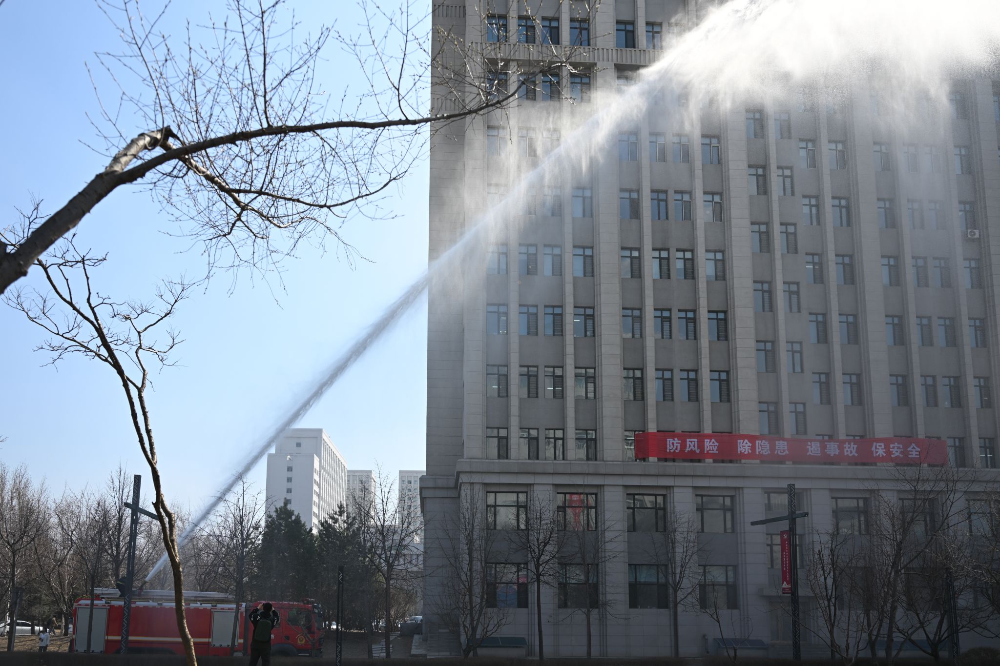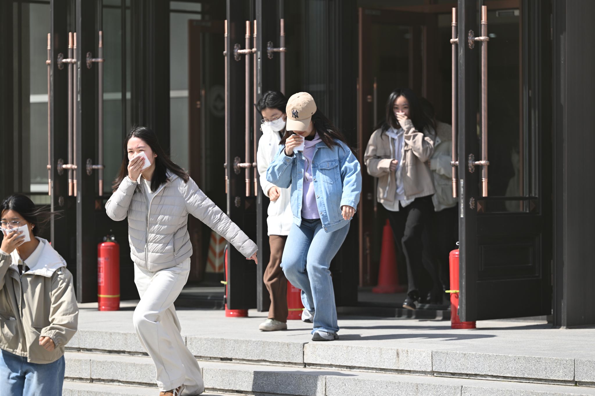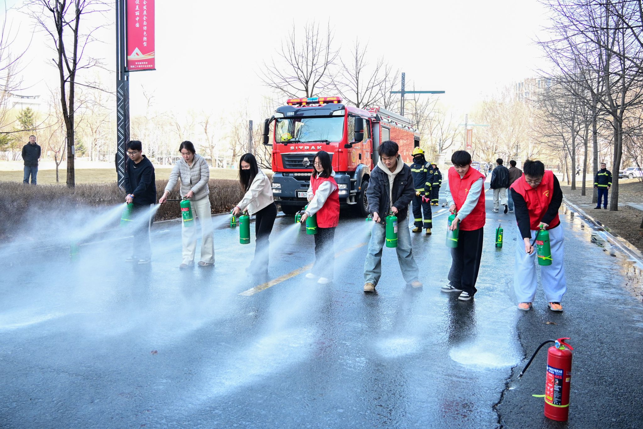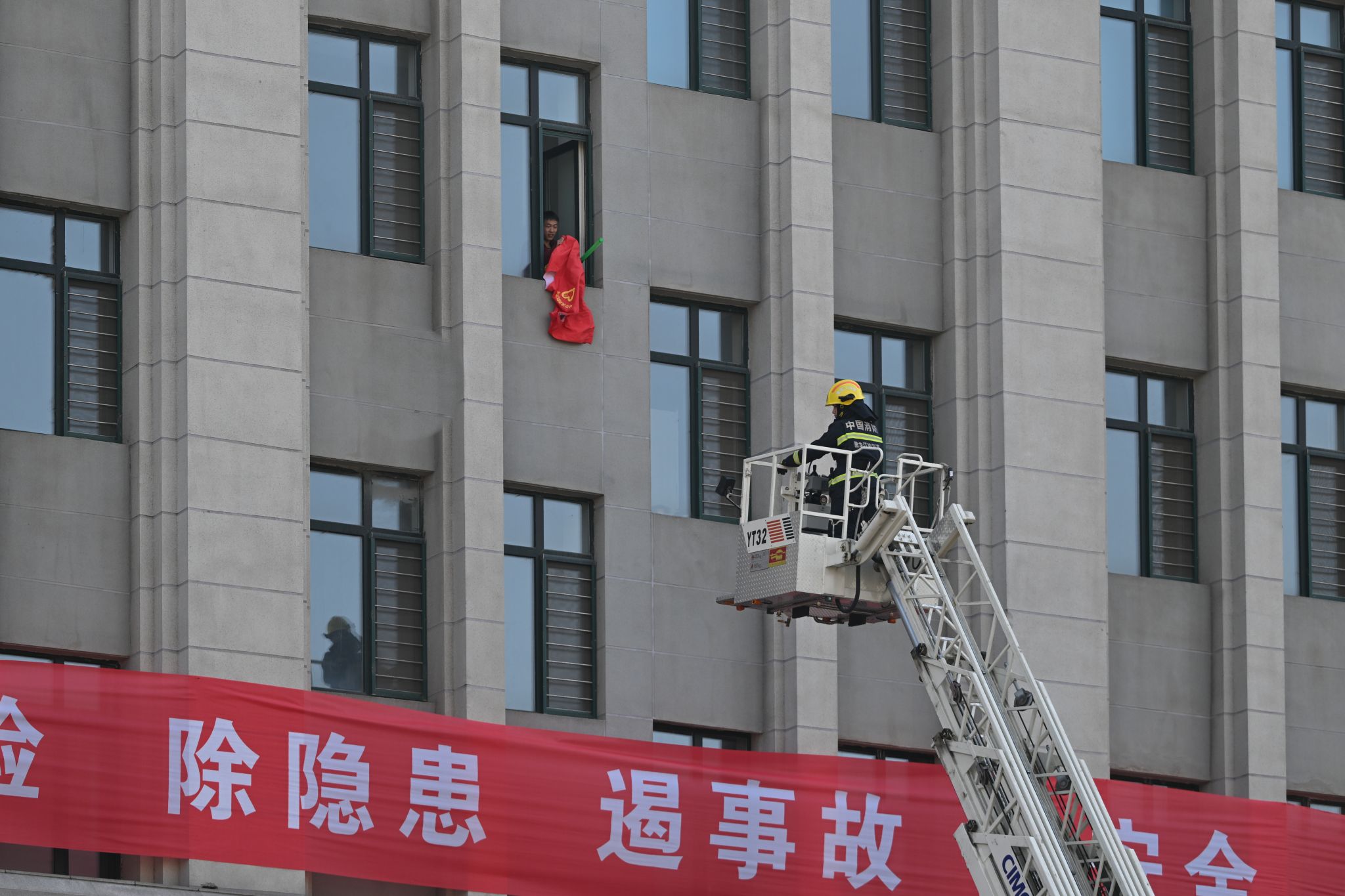 消防实战演练设置模拟疏散逃生、高空救援及喷水灭火等实景科目。火情警报响起后,文博楼千余名学生在引导组指挥下,严格遵循高层逃生要点,捂鼻低姿沿预定路线有序撤离至安全区域;成栋楼高层“受困人员”被消防员通过云梯安全转移,消防员开展模拟喷水灭火作业。消防员还现场示范“提、拔、瞄、压”操作规范,并组织学生代表实操体验,强化师生火灾应急处置能力。