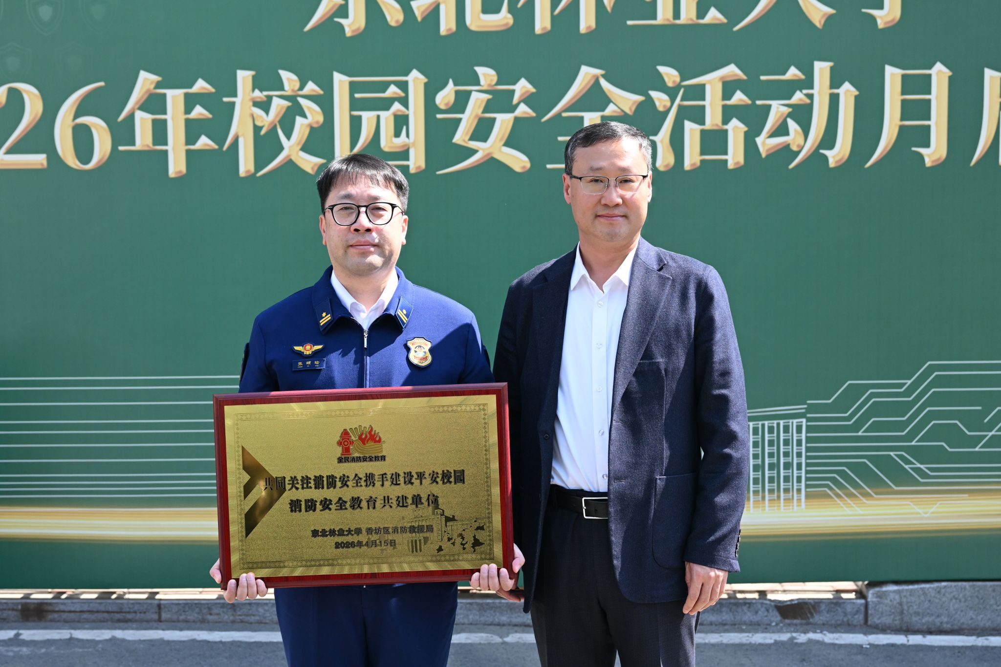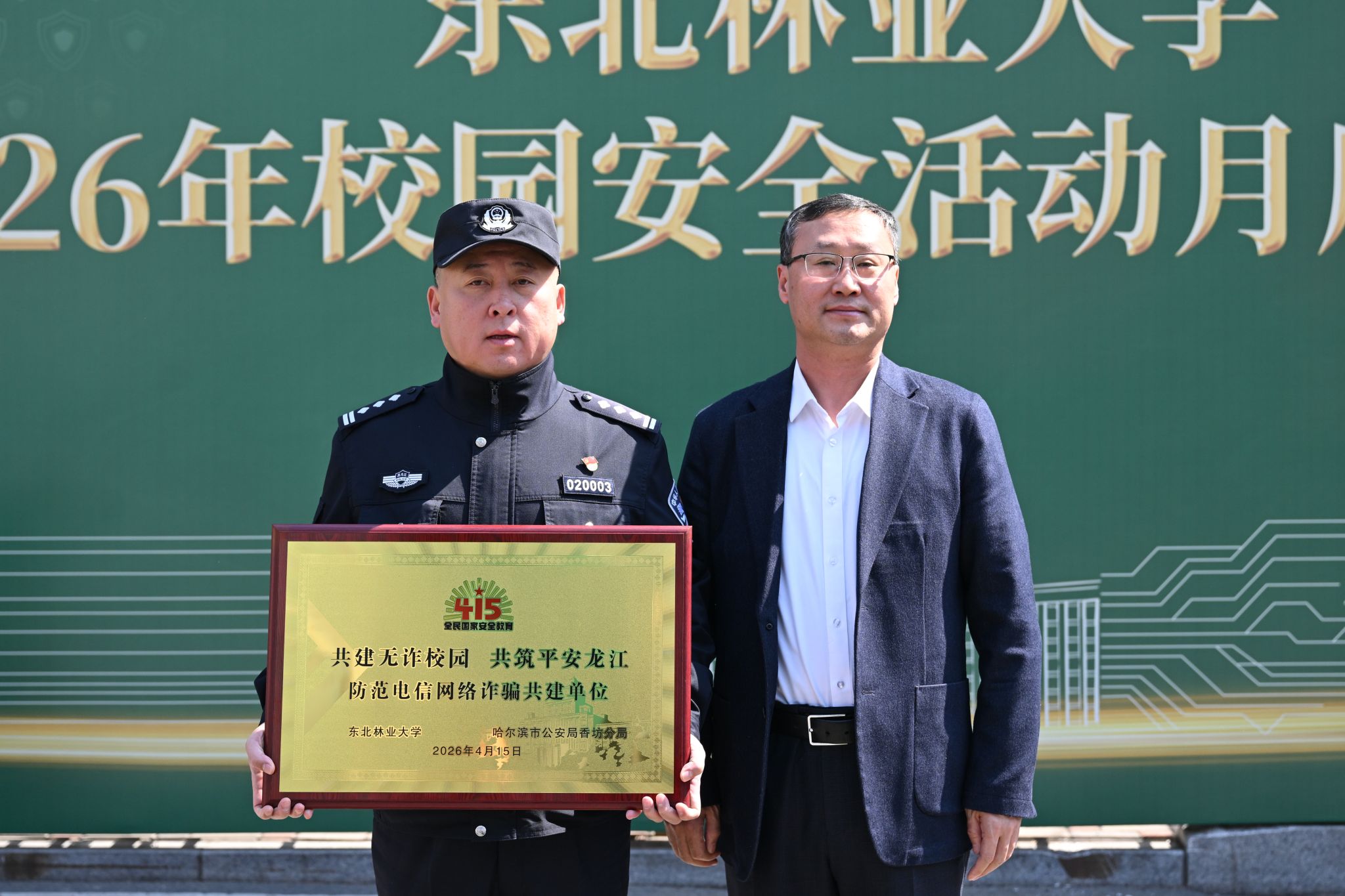 宋文龙为学校共建单位:哈尔滨市公安局香坊分局和香坊区消防救援局分别授牌“防范电信网络诈骗共建单位”“消防安全教育共建单位”。校地双方将携手聚焦校园反诈、消防安全等重点领域,构建起共建共享的安全防护体系。