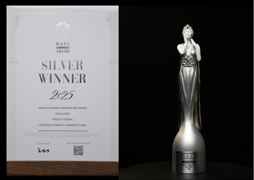 近日,2025 MUSE Design Awards缪斯设计奖获奖名单公布,我校家居与艺术设计学院教师张杨的手工笔设计作品《MASONLIN SERIES HANDMADE PEN DESIGN》,以其独特的设计理念及材料工艺,在全球45个国家的3600多份参赛作品中脱颖而出,荣获2025 MUSE Design Award银奖。