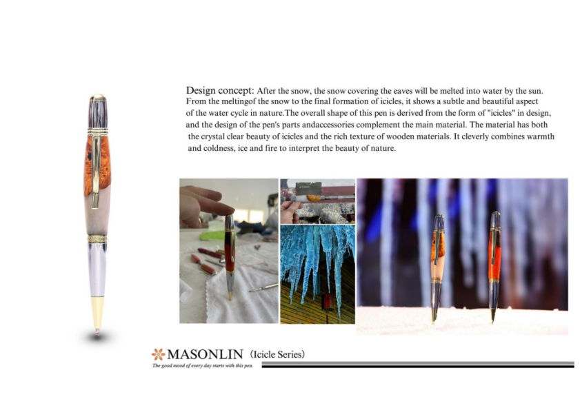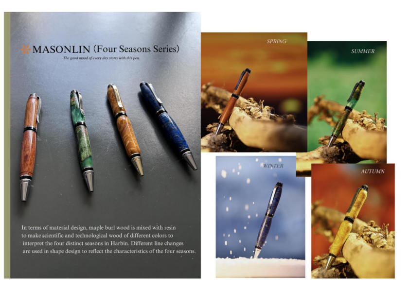 我校教师的手工笔作品《MASONLIN》是一系列纯手工打造的木制笔,由设计者手工制作而成,以哈尔滨独特的地域文化为载体展开的创意构想,通过对笔的造型与材料的设计,表达这座城市中不同的设计主题,来展现哈尔滨的冰雪文化、欧式建筑特征、丁香花之美以及哈尔滨的四季变化。意在以笔为载体,蕴城市之特色,展尔滨之风采。