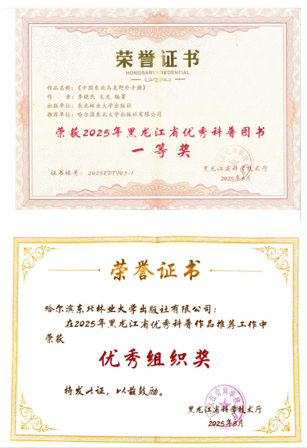 近日,学校出版社出版的《中国东北鸟类野外手册》和《黑龙江呼中国家级自然保护区大型真菌原色图鉴》两部图书成功入选由省委宣传部组织评审的2025年度黑龙江省优秀学术著作。其中,《中国东北鸟类野外手册》更是在黑龙江省科学技术厅组织评选的2025年黑龙江省优秀科普作品征集评选活动中,从百余种参与评选的优秀科普作品中脱颖而出,获评优秀科普图书作品一等奖。出版社也获得优秀组织奖的殊荣。