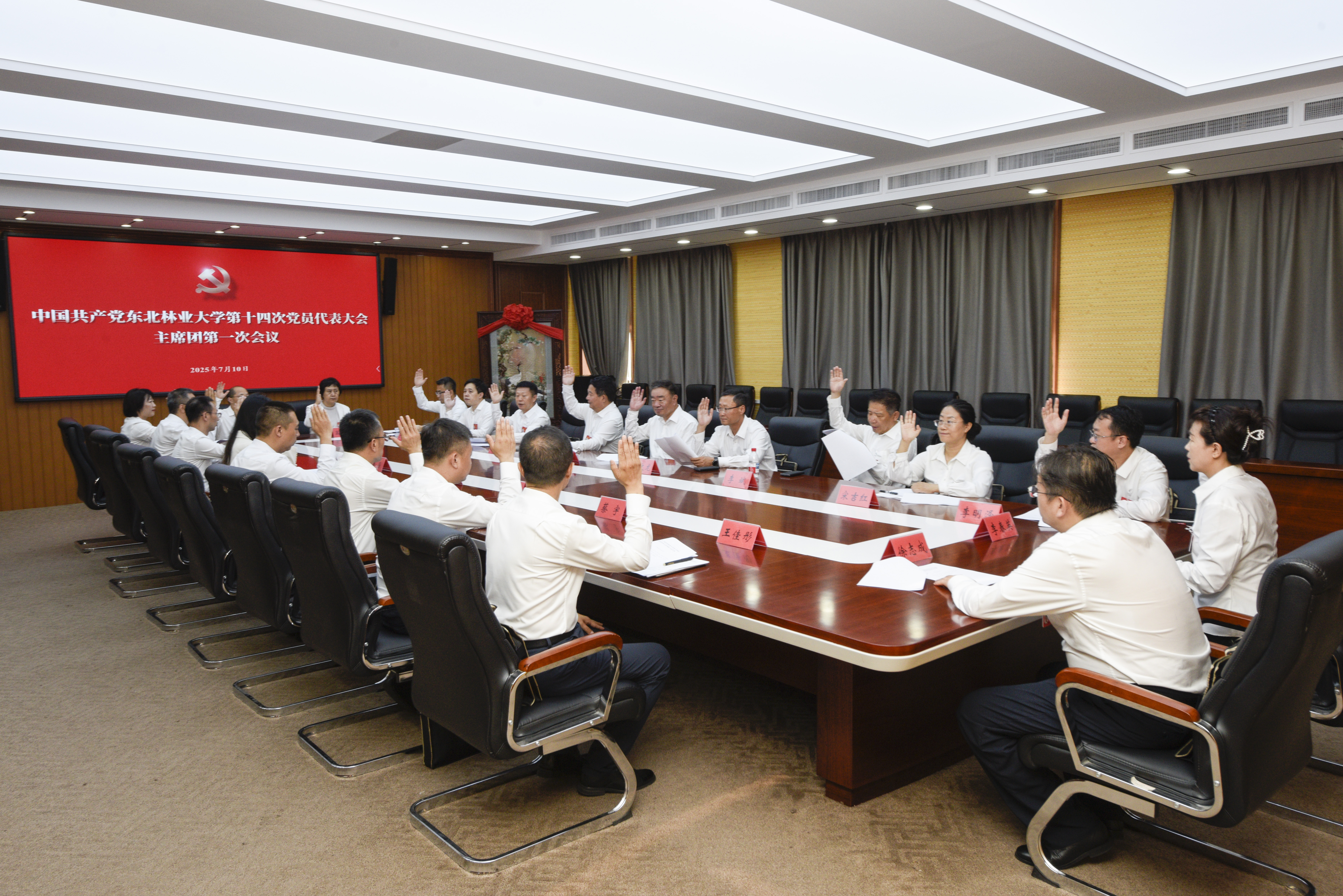 预备会结束后,大会主席团在综合楼10楼会议室举行第一次会议。大会秘书长翟雪峰同志主持会议。会议通过《中国共产党东北林业大学第十四次党员代表大会日程》,通过大会列席人员名单、执行主席名单、副秘书长名单,通过第十四届“两委”委员候选人建议名单,通过《党费收缴、使用和管理情况审查报告(草案)》。