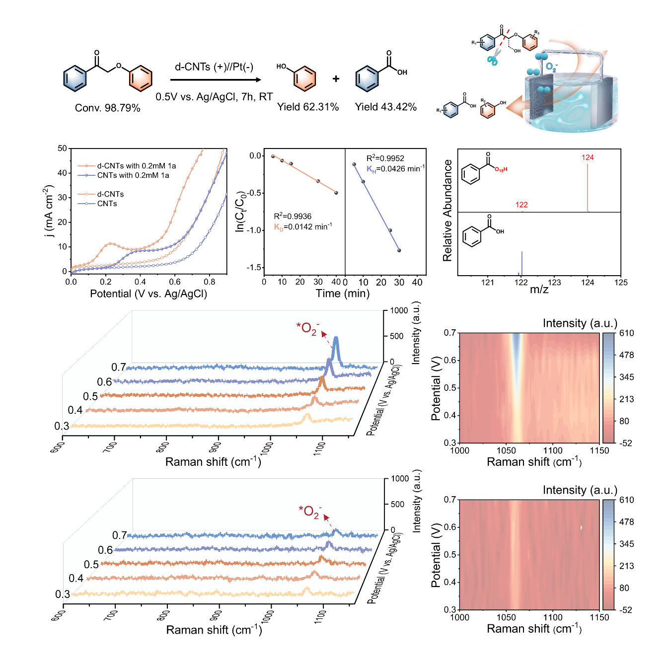 该研究采用了富缺陷的碳纳米管(d-CNTs)作为电催化剂。通过同位素标记、原位拉曼光谱表征、理论计算等手段证明原位OER过程中的氧气脱附被抑制,从而保留了活性氧物种(O2),其与木质素烯醇中间体结合,促进木质素Cα–Cβ键裂解。无外源氧化剂的情况下,在仅为0.5 V vs. Ag/AgCl电位时,木质素模型化合物2-苯氧基苯乙酮转化率为98.8%,产物苯酚、苯甲酸的得率分别为62.31%和43.42%。此外,经预氧化的杨木木质,在该电催化体系下解聚产生了高达12.41 wt%的芳香单体。该研究为碱性条件下电催化木质素解聚过程中Cα–Cβ键断裂的机制提供了新的见解。