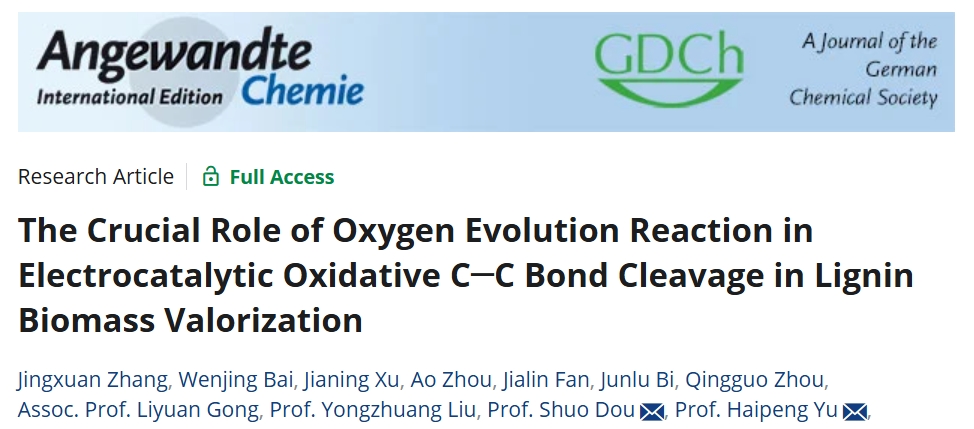 近日,我校木本油料资源利用全国重点实验室/生物质材料科学与技术教育部重点实验室于海鹏、窦烁团队在国际著名期刊Angewandte Chemie International Edition上发表了题为“The Crucial Role of Oxygen Evolution Reaction in Electrocatalytic Oxidative C─C Bond Cleavage in Lignin Biomass Valorization”研究论文。该研究构建了OER辅助的电催化Cα–Cβ键裂解体系,利用OER过程中稳定存在的活性氧物种O2作为木质素Cα–Cβ键断裂的氧源,实现了模型物和天然杨木木质素的解聚。这些发现为OER在电催化木质素高值化利用中的关键作用提供了新的见解,促进了该天然生物质的高值利用。