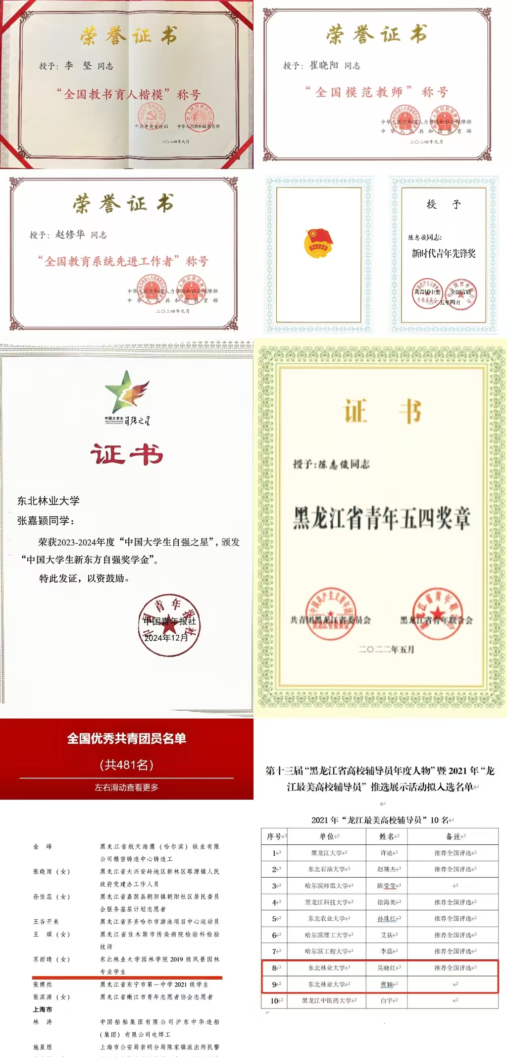十三次党代会以来,教师榜样不断涌现,学校获评全国教书育人楷模、全国高校黄大年式教师团队等省级以上教师荣誉表彰30项。21名师生获评“全国新时代青年先锋奖”“全国基层理论宣讲先进个人”“全国优秀共青团员”“中国大学生自强之星”“黑龙江省青年五四奖章”“龙江最美高校辅导员”等荣誉。