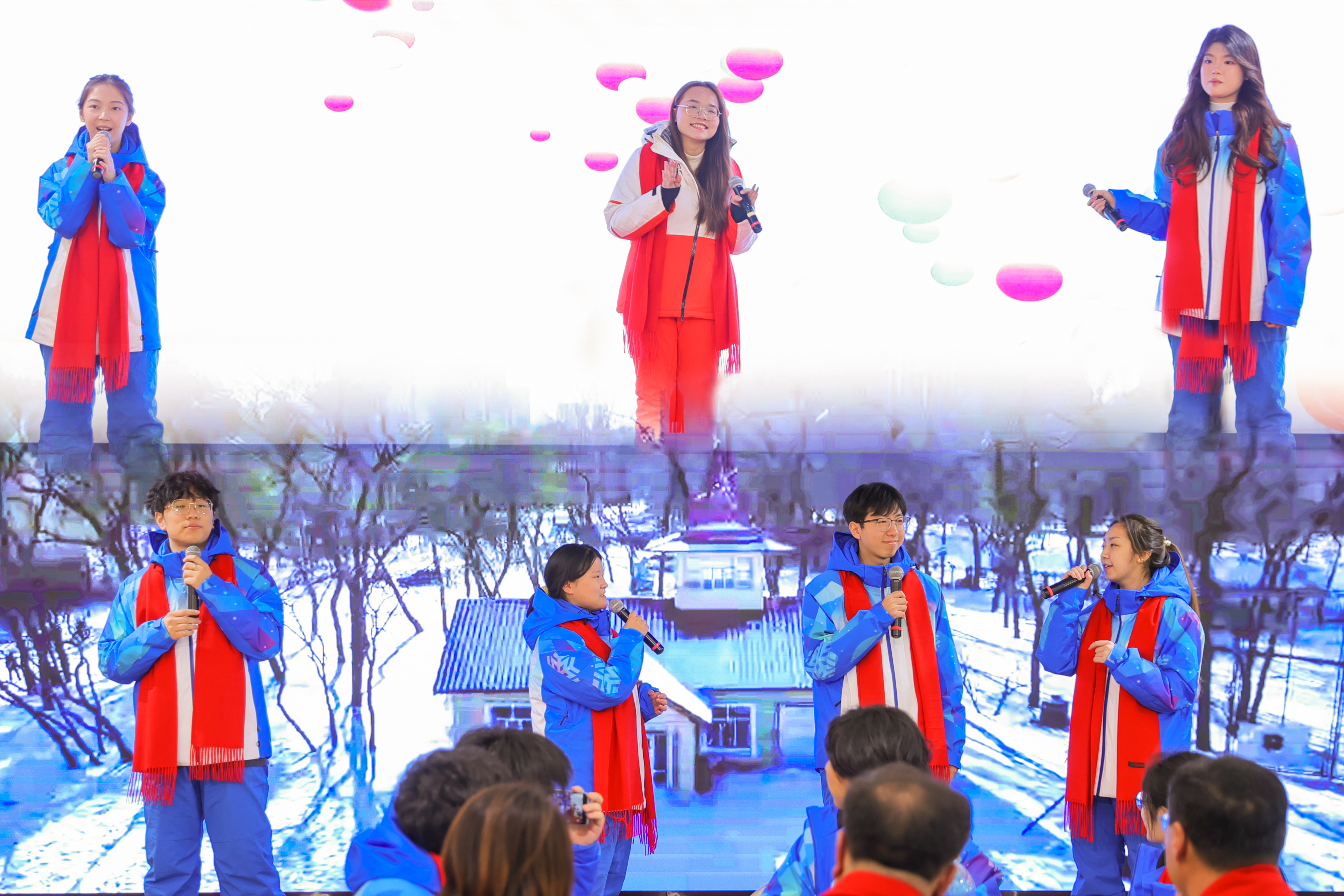 志愿者代表演唱了亚冬会会歌《尔滨的雪》,吹响了赛会志愿服务号角;留学生和志愿者代表们带来了歌曲《遇见》,表达了留学生们遇见东林,遇见中国的喜悦,更唱出了对蛇年新春的美好祝福和期冀。