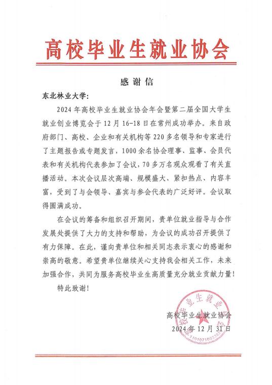 2024年12月31日,高校毕业生就业协会向我校发来信函,感谢我校对2024年高校毕业生就业协会年会暨第二届全国大学生就业创业博览会成功召开给予的支持和帮助。