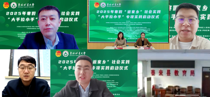 1月15日上午,东北林业大学2025年寒假“返家乡”社会实践“大手拉小手”专项实践启动仪式,通过线上、线下相结合的形式举行。宾县县委副书记马平,泰来县副县长黄英来,团香坊区委书记王喆,团宾县委书记黄东旭,团大兴安岭地委科长范清华,学校团委副书记王海飙,理学院党委书记李玉荣、党委副书记李鹏,相关县、区教育局负责同志,对接21所中小学校校长、辅导员出席启动仪式。2100余名中小学生、家长、大学生志愿者以及学校第27届研究生支教团成员线上参会。会议由学校团委挂职副书记、理学院团委书记王莹主持。