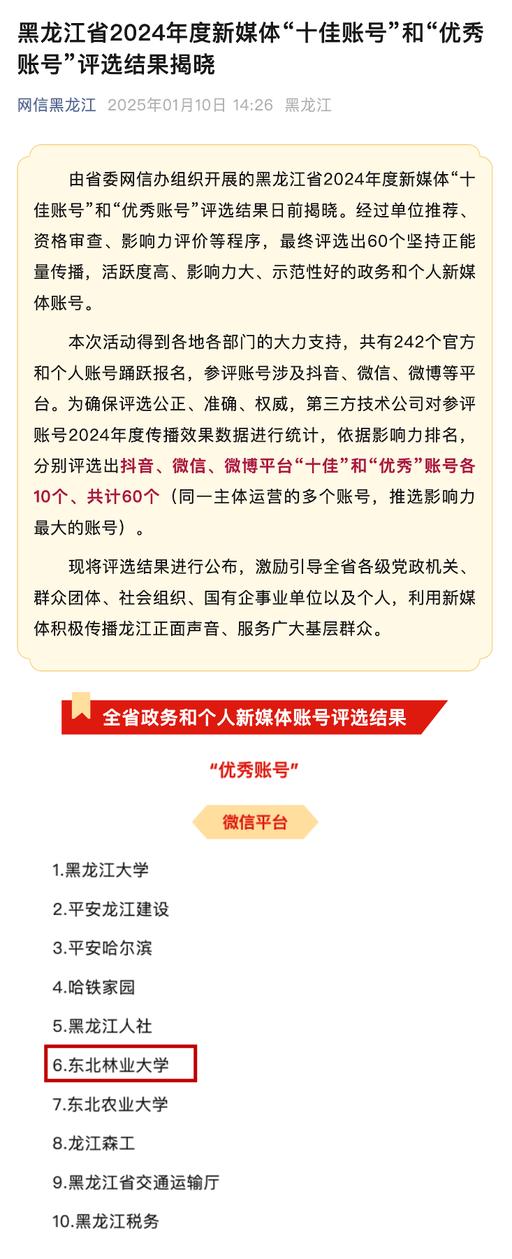 近日,黑龙江省委网信办组织开展黑龙江省2024年度新媒体“十佳账号”和“优秀账号”评选,我校官方微信号“东北林业大学”获评“年度新媒体‘优秀账号’”。