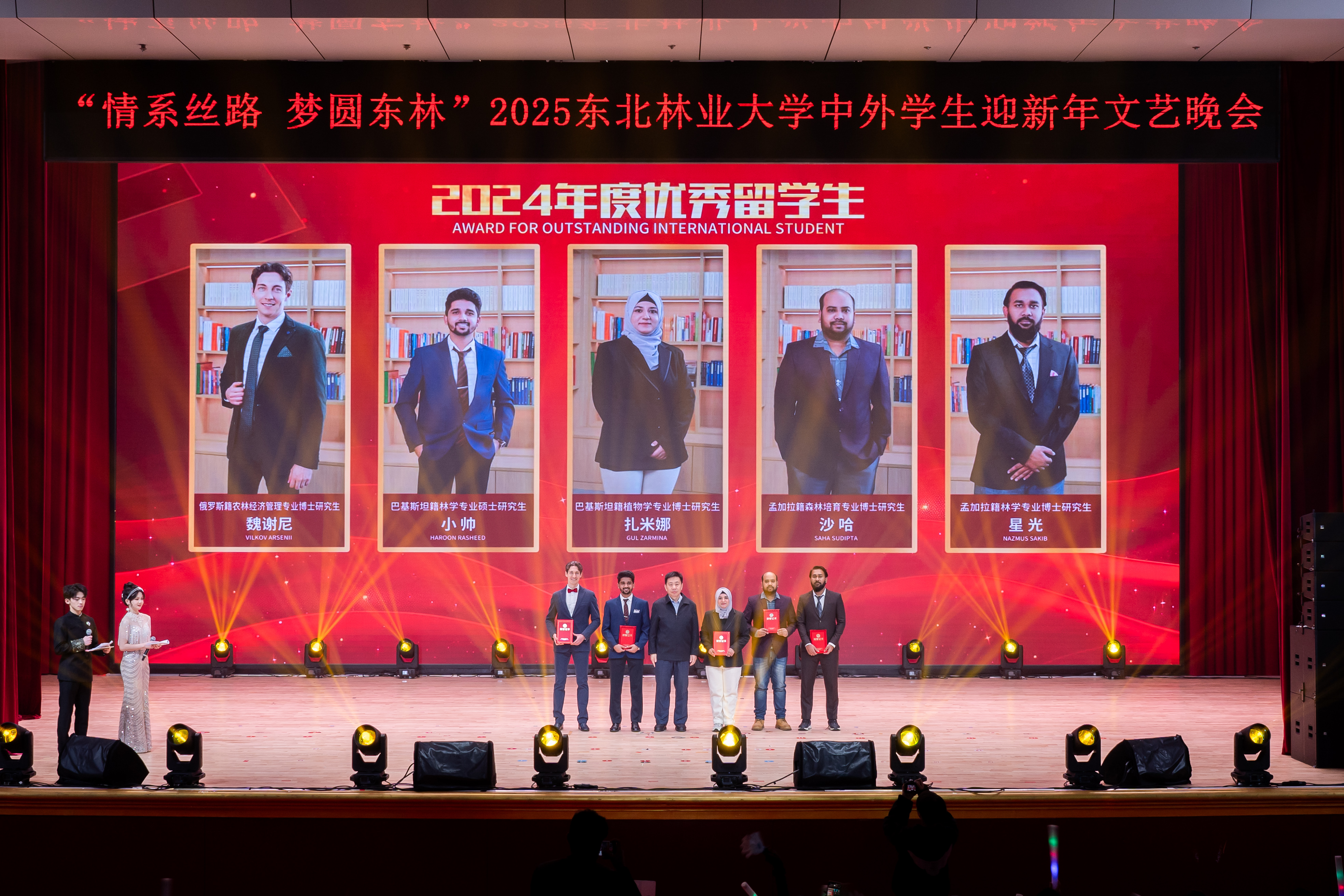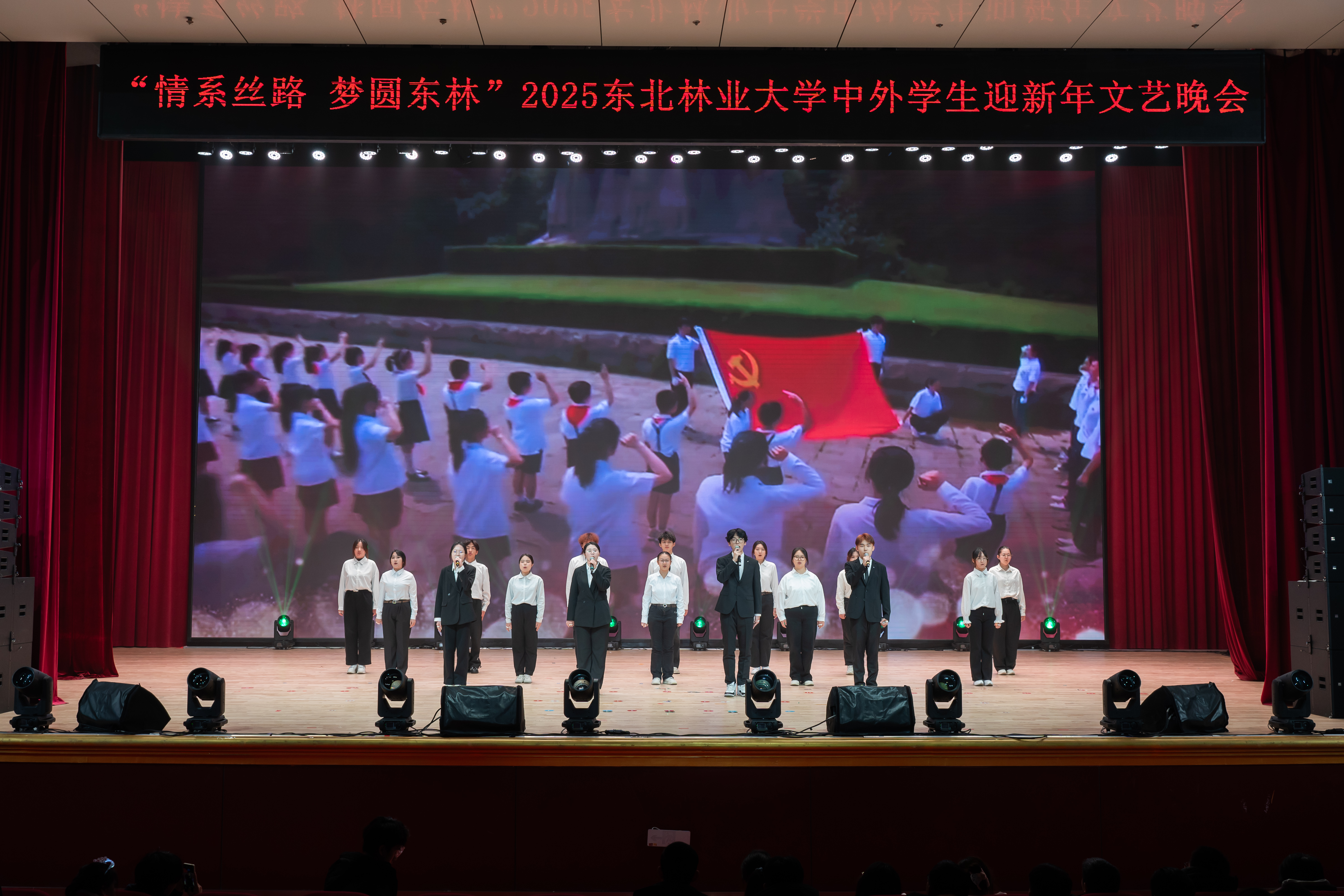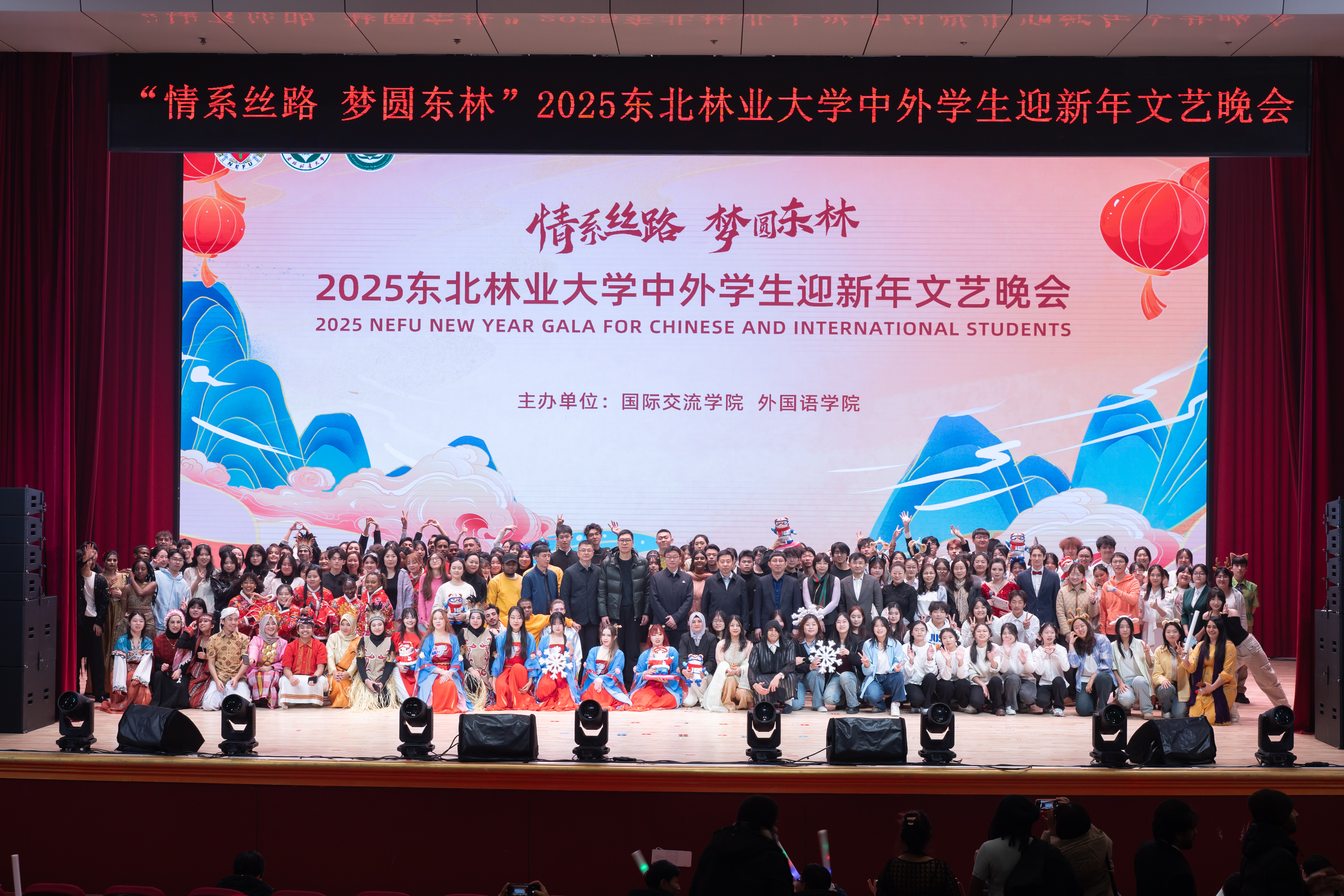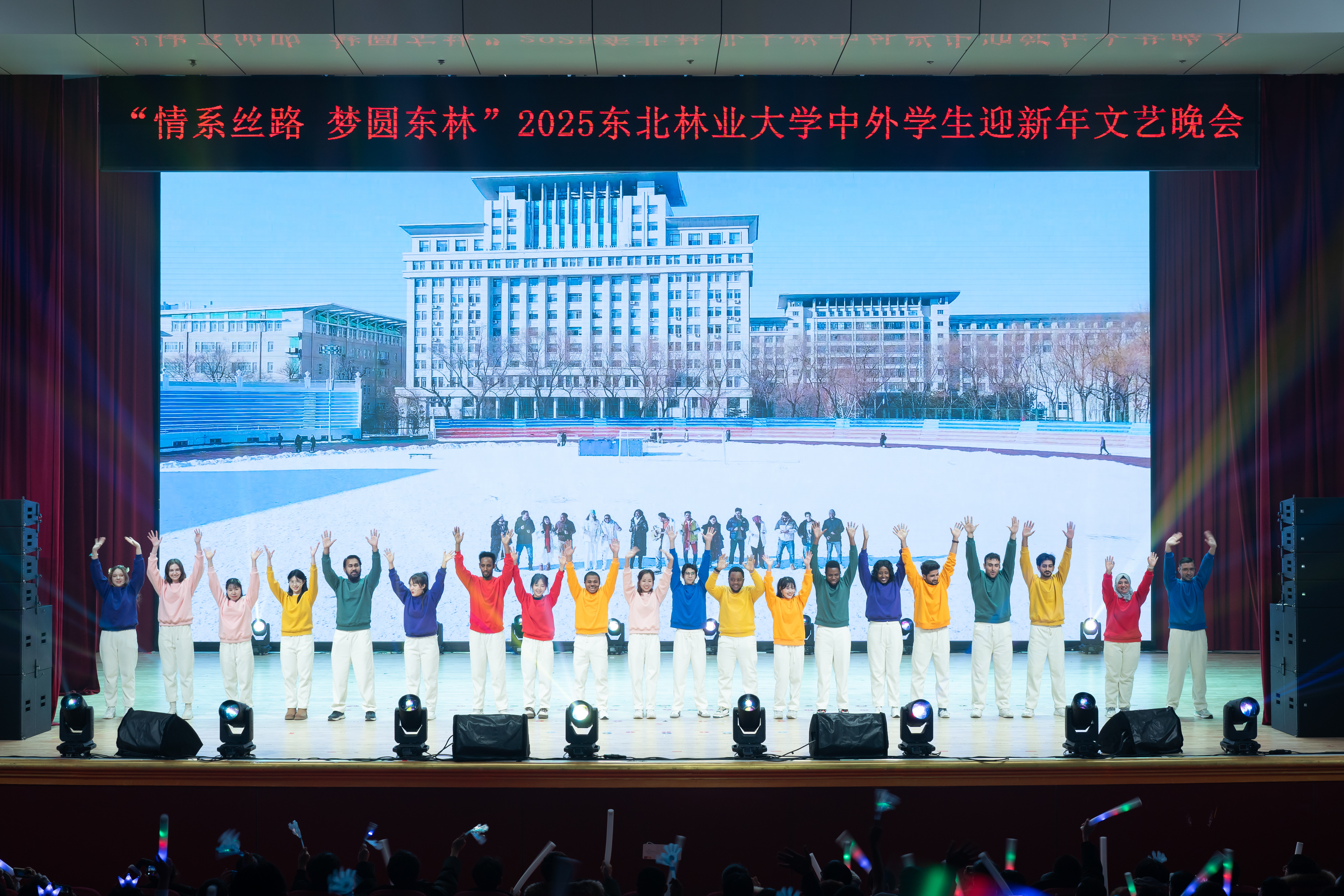 12月19日晚,2025东北林业大学中外学生迎新年文艺晚会在科学会堂举行。黑龙江省教育厅对外合作与交流处处长王少松,学校党委常委、副校长刘守新出席晚会,省内兄弟院校师生代表、学校相关职能处室负责人和各学院副书记与近千名师生欢聚一堂、共迎新年。