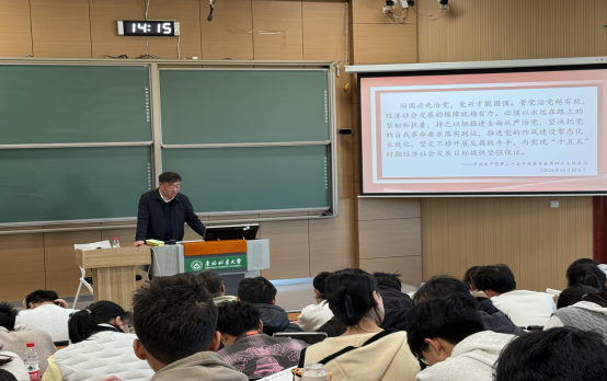 为深入学习贯彻习近平新时代中国特色社会主义思想,宣讲宣传党的二十届四中全会精神,12月12日下午,学校党委书记孙猛走进“习近平新时代中国特色社会主义思想概论”课堂,围绕全面从严治党,为2025级本科生讲授了一堂有深度、有温度、有厚度的思想政治理论课。