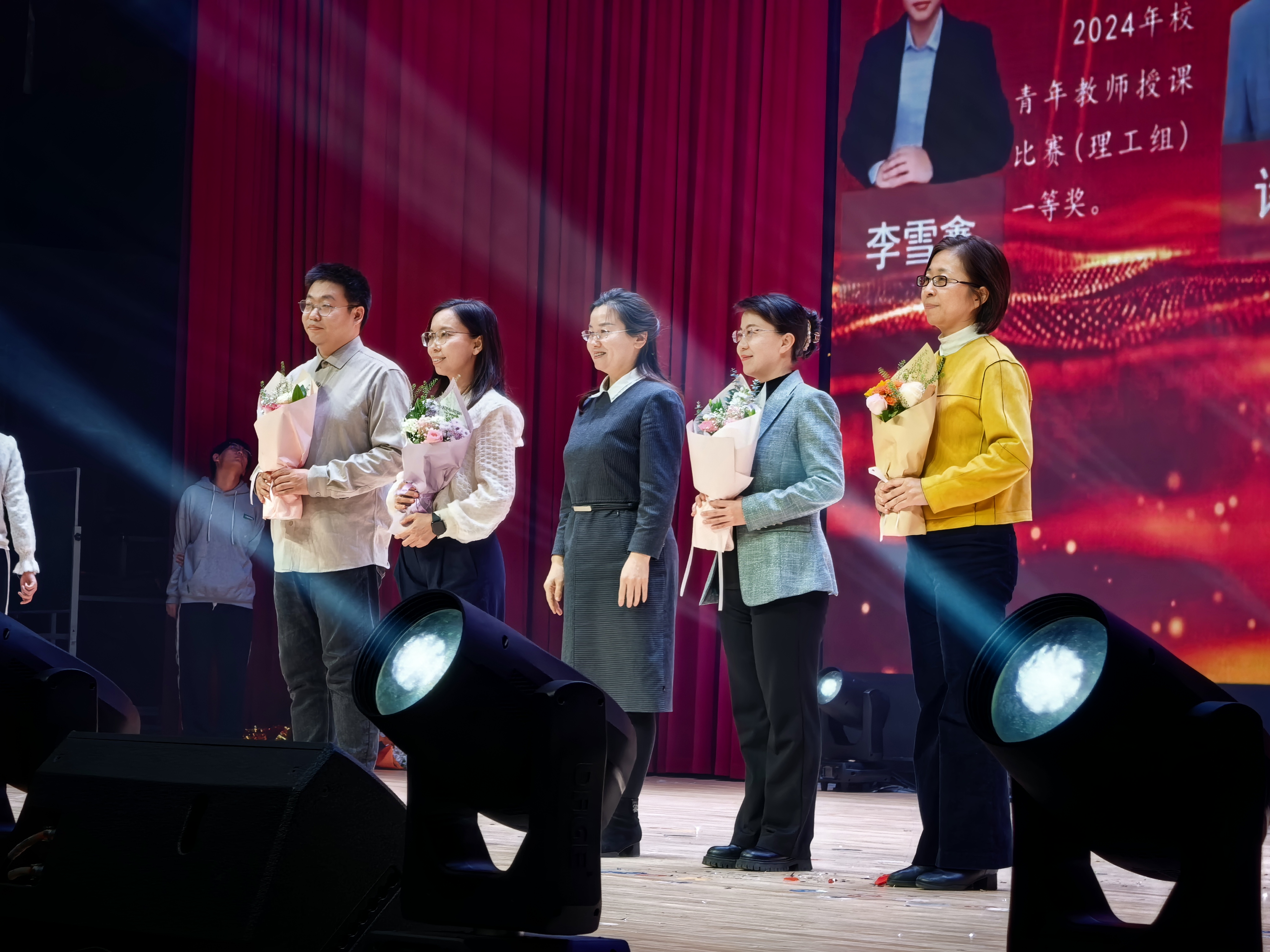随后,晚会特别向深耕讲台三十八载、即将荣休的曲智林教授致敬,教研室主任、中青年教师代表谭畅老师为曲老师献花,全场以持久掌声向这位潜心育人的学者表达崇高敬意,教育薪火在此刻温暖传承。