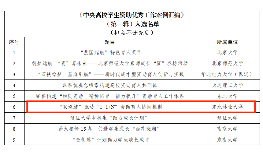 近日,教育部全国学生资助管理中心印发《中央高校学生资助优秀工作案例汇编(第一辑)》,我校报送的化学化工与资源利用学院资助育人工作案例《“双螺旋”驱动“1+1+N”资助育人协同机制》成功入选。