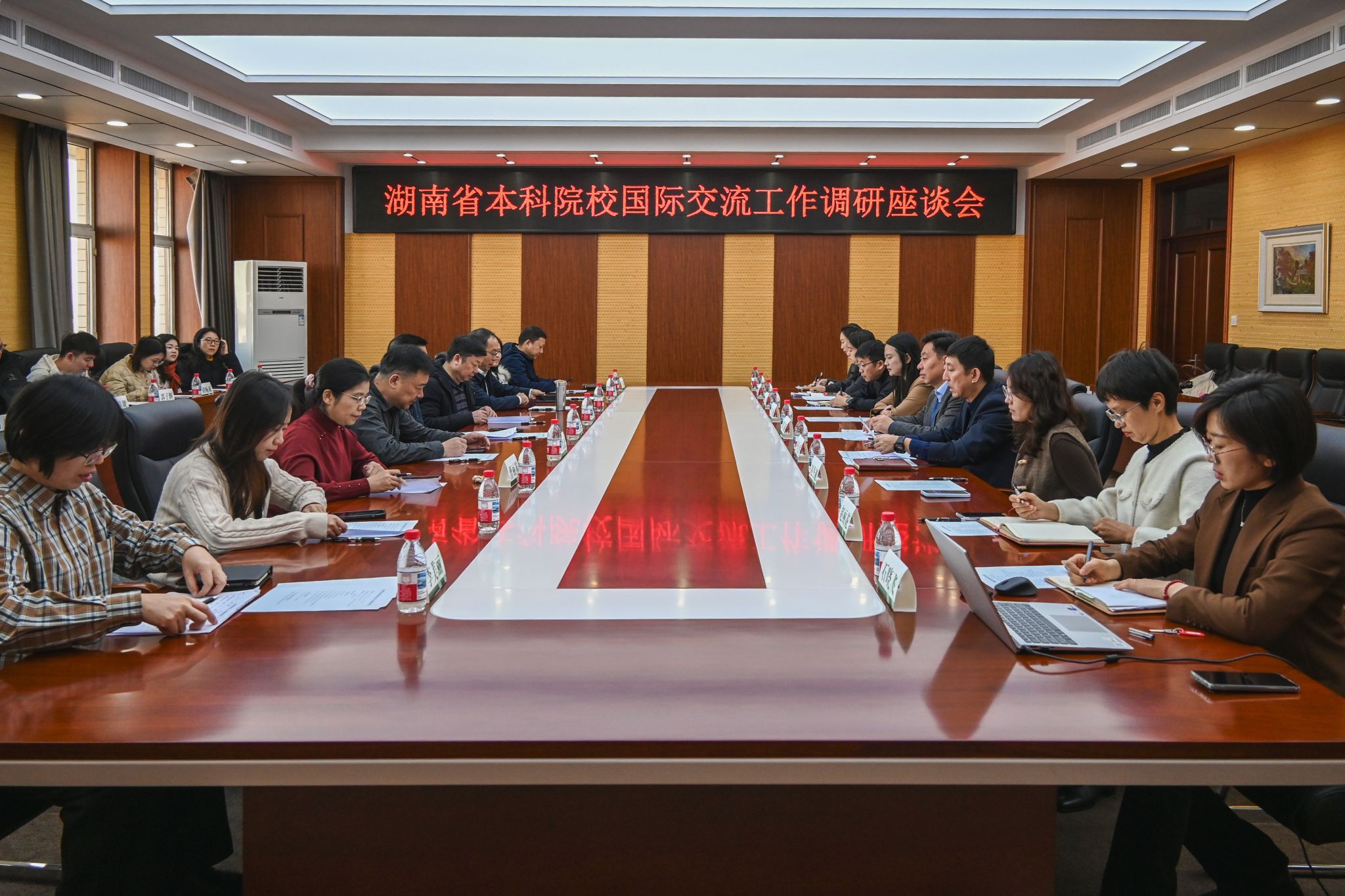11月28日上午,湖南省教育国际交流协会副会长兼秘书长潘送球与湖南省12所本科院校国际交流工作负责人一行21人来校,就国际交流相关工作进行交流调研。学校党委常委、副校长刘守新出席座谈会,我校国际合作处、国际交流学院、奥林学院相关同志参会。黑龙江省教育厅对外合作与交流处、黑龙江省教育国际交流协会相关负责同志陪同调研。