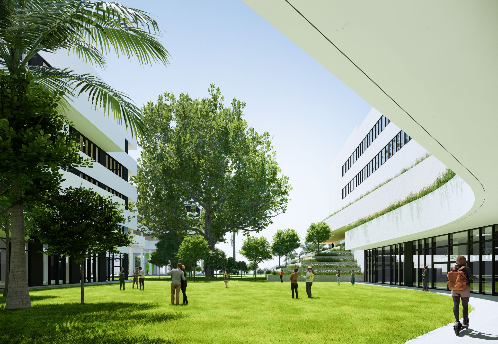 项目选址在海南陵水黎安国际教育创新试验区的百年古树附近,其设计理念深度契合东林“学参天地,德合自然”的校训精神,功能布局全面贴合东林在海南就读师生的专业教学、实验研究、学术研讨与国际交流等核心需求。项目由教学楼、科研楼、国际联合研究中心三座单体建筑组成。其中,教学楼集专业教学、研讨讲座、交流活动、行政办公、国际交流及学术会议等功能于一体;科研楼设有计算机科学与技术实验区、机械工程试验区、生物与先进材料试验区、土木工程实验室等多个专业实验空间,配备各类高标准实验室、实验用房及相关学科研究中心;国际联合研究中心则为中外合作办学量身打造多样化科研空间,可根据使用场景灵活调整,为联合办学、学术研讨、工作营、工作室等活动提供坚实的空间支撑。