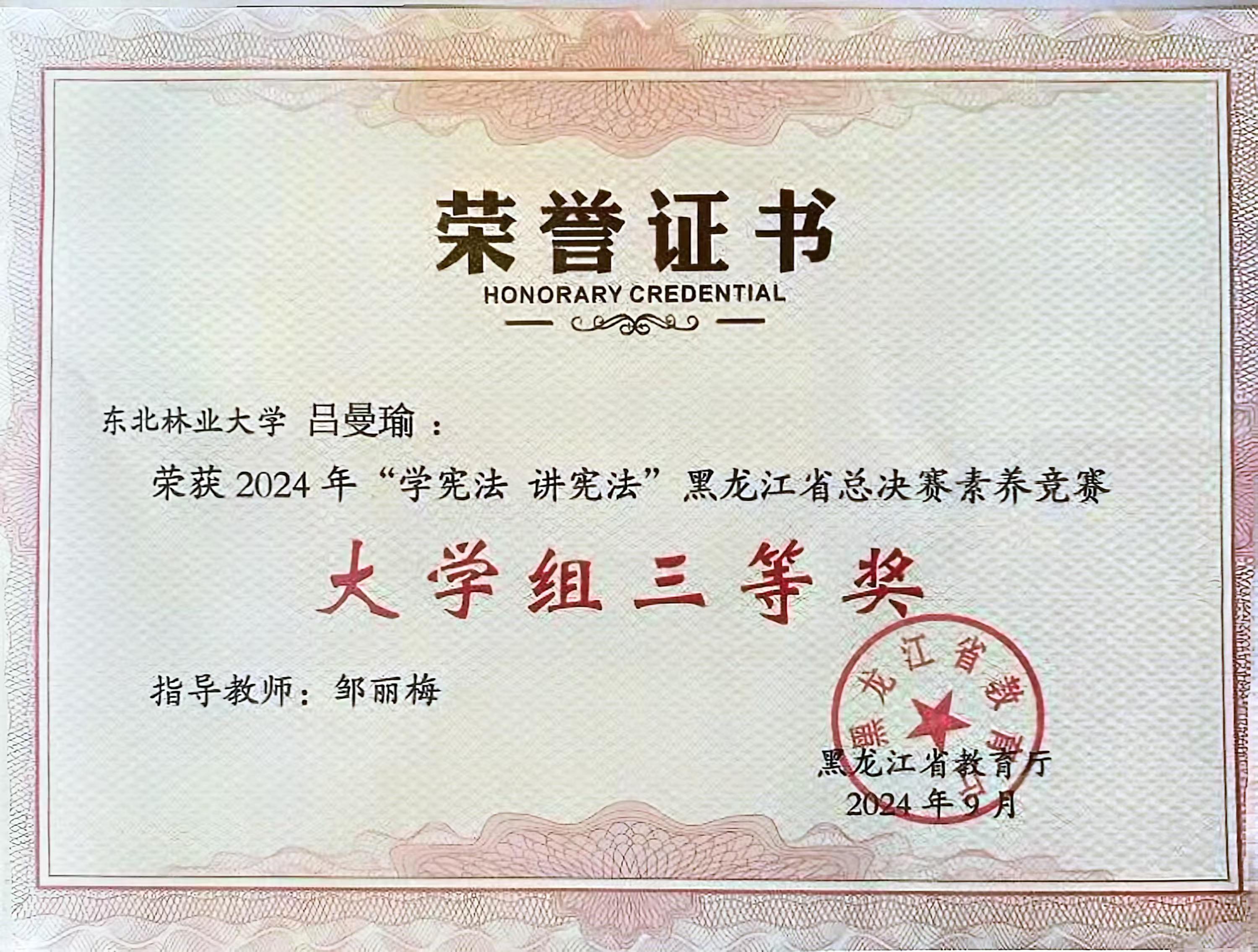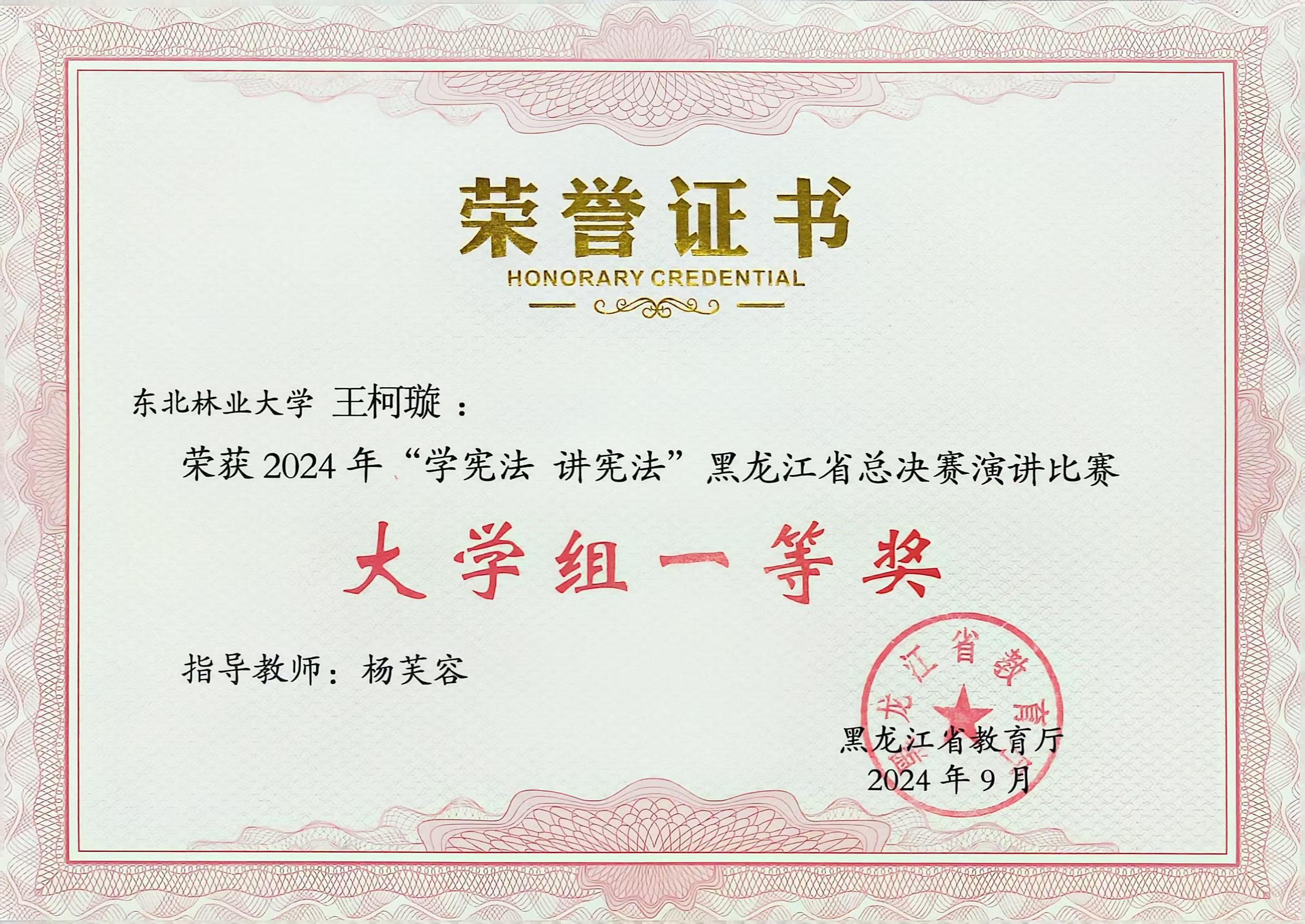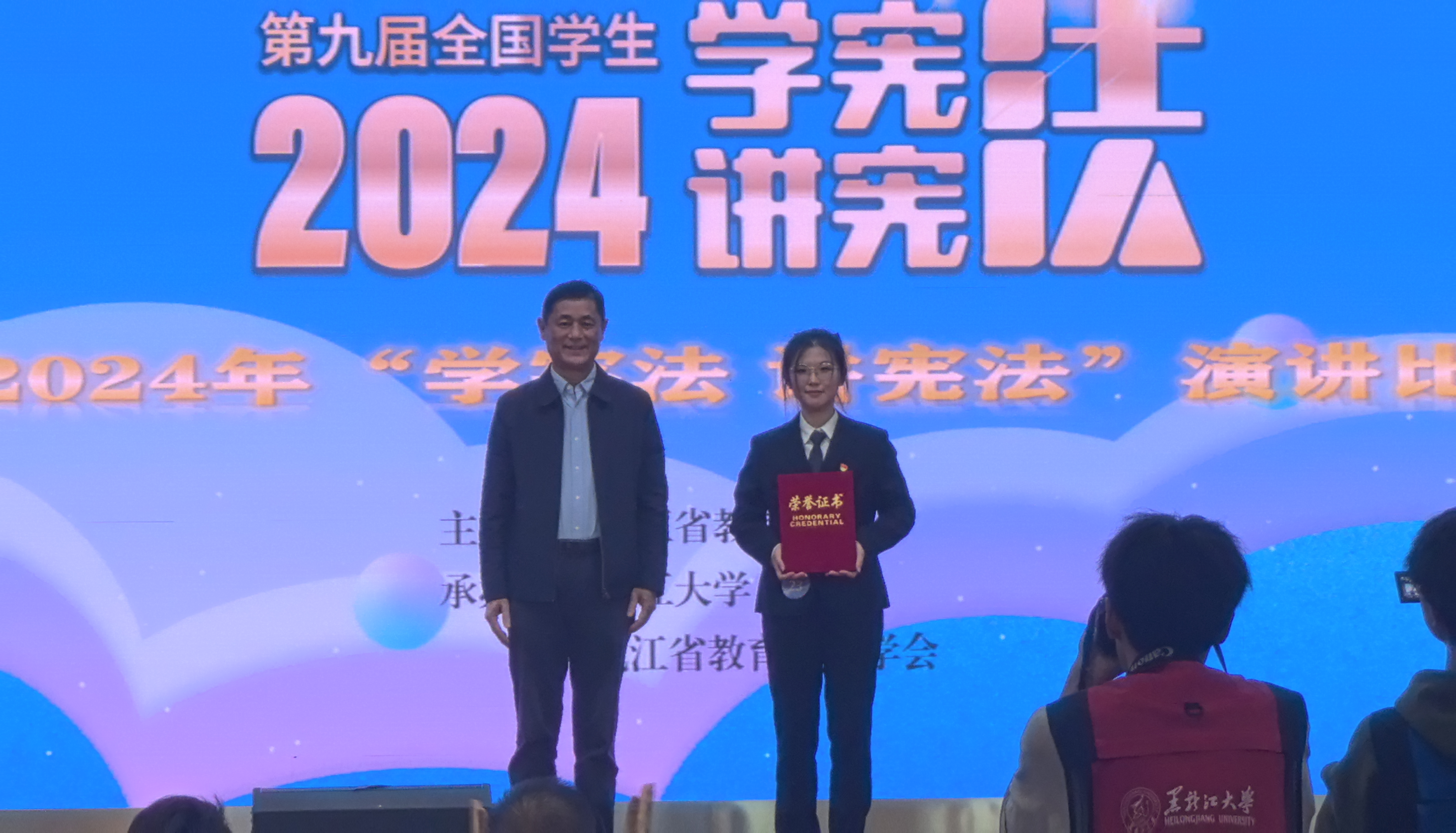 9月22日,由黑龙江省教育厅主办的2024年“学宪法 讲宪法”黑龙江省总决赛在黑龙江大学举行。经过激烈角逐,我校土木与交通学院王柯璇同学荣获演讲比赛一等奖,文法学院吕曼瑜同学荣获素养竞赛三等奖。